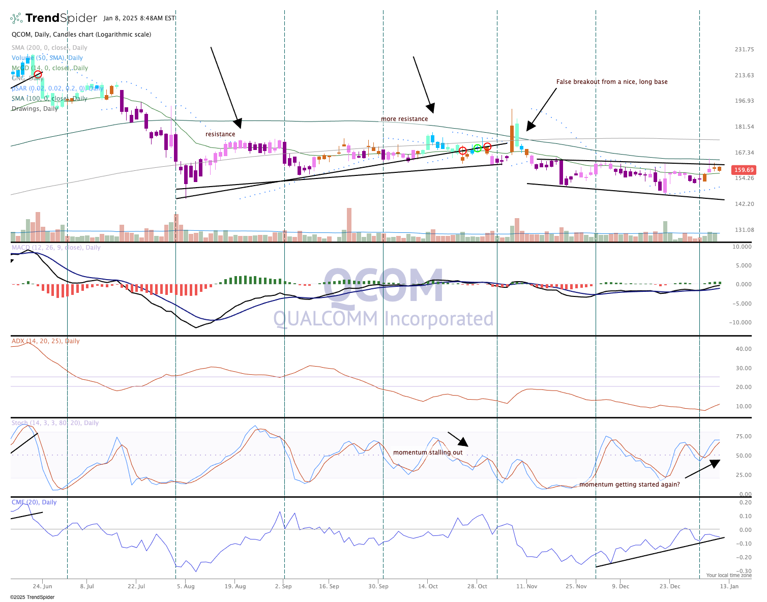 Semiconductor stocks have mostly been higher over the past year but certainly ran into a buzzsaw of sellers last summer. Such was the case for TheStreet Pro Portfolio holding Qualcomm QCOM, which was pounded mercilessly in July but found a low and started to build a solid base. However, that breakout in November failed miserably as the new stock buyers shed Qualcomm in short order.