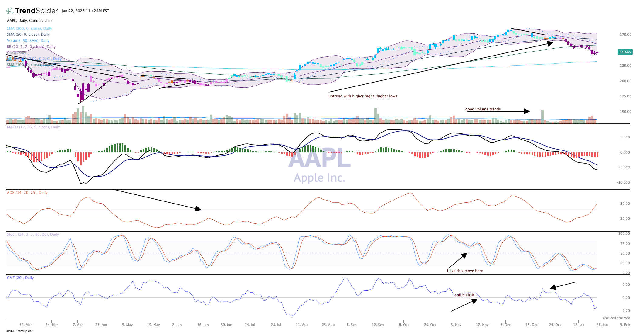 Apple's chart is clearly bearish. Momentum is swinging down, and the MACD (moving average convergence divergence) has been on a sell signal for weeks. Money flow is bearish and the candles are purple, which is bearish on the GoNoGo composite of indicators.