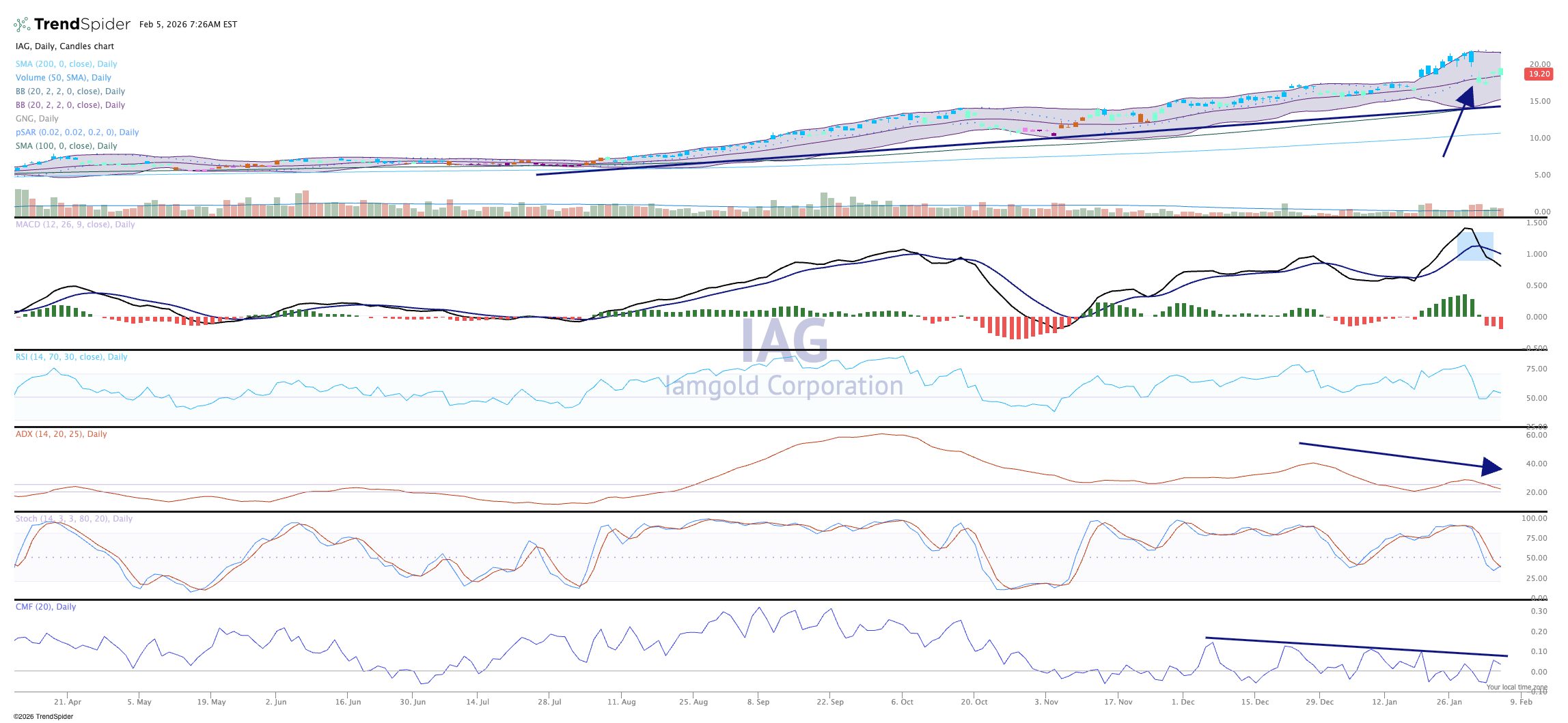 The recent volatility in gold has of course hit IAG rather hard, but this pullback to short-term support (20-day moving average) might be an ideal place to add shares. Indicators look bearish but it only means the momentum is slowing down.