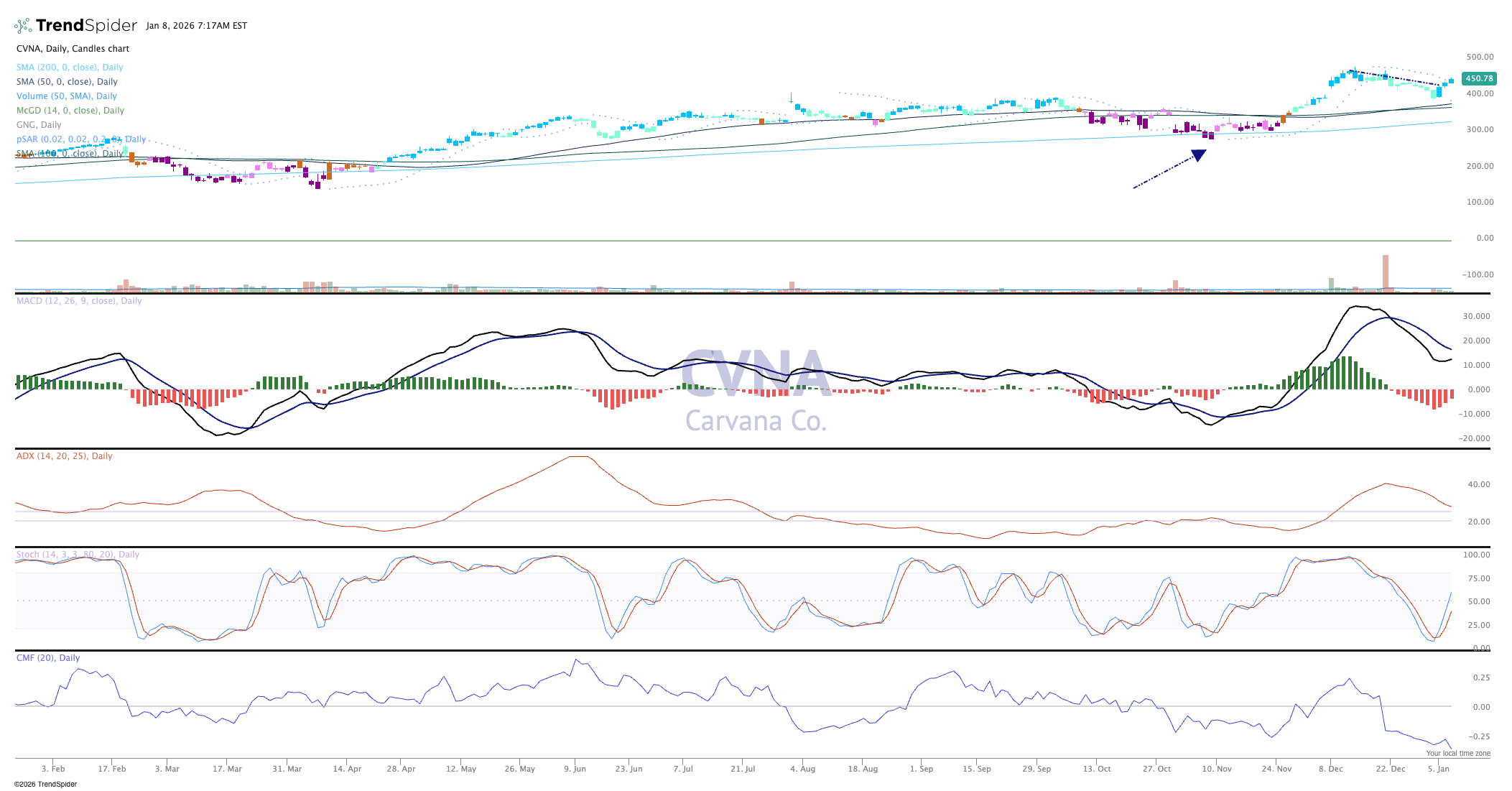 The chart shows tremendous strength and power in this stock, with higher-highs and higher-lows, which qualify Carvana as being in an uptrend.