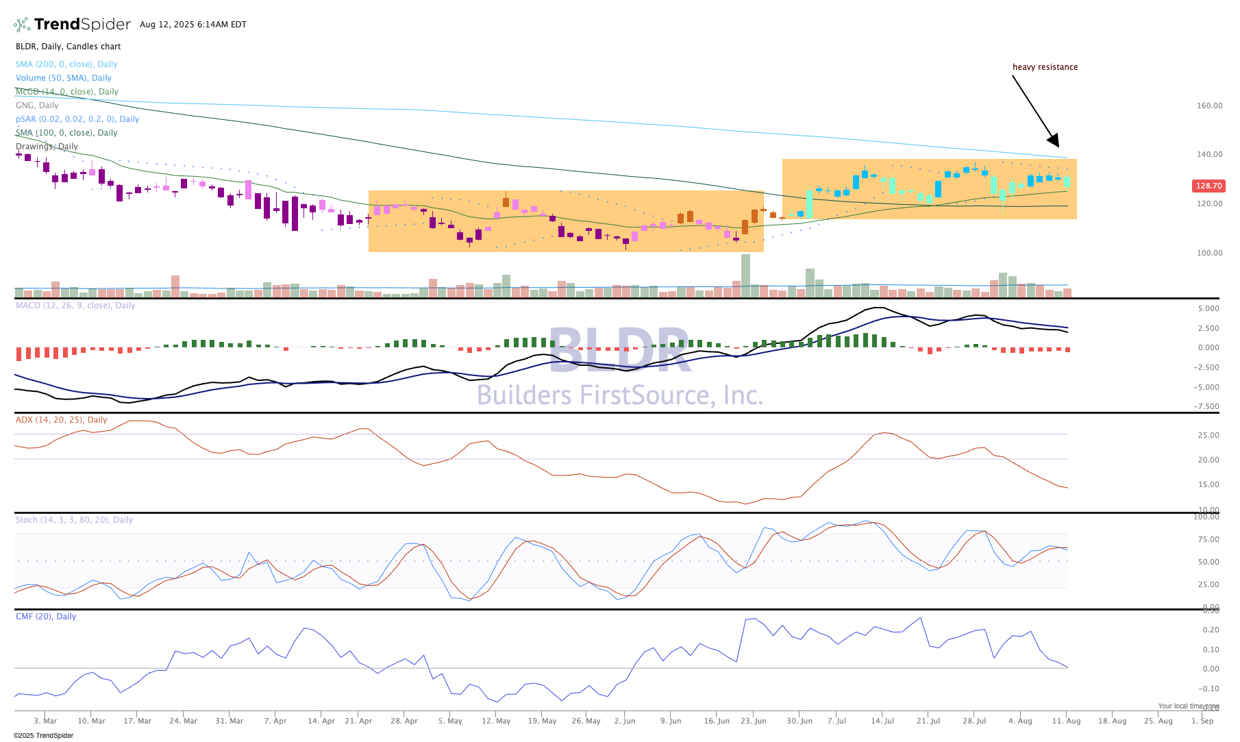 We'll check the box on this one as being bullish. Further, the candles recently have been blue or green, and that is bullish. The chart shows BLDR is starting to encounter resistance at the 200-day moving average.