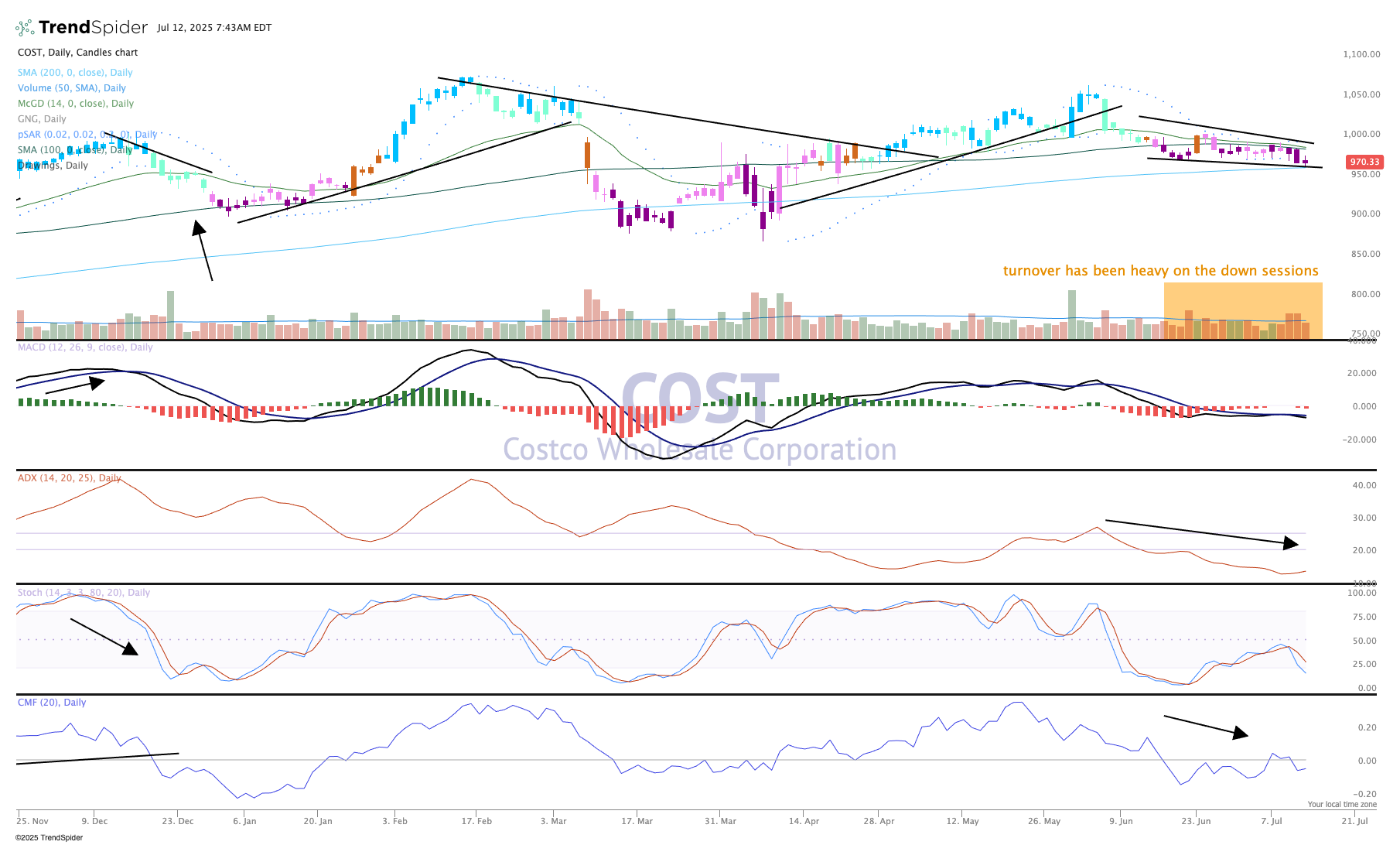 Now, that does not mean the shares should be sold, in fact, if we see that Costco can hold current levels of support at the 200-day moving average then we will know this level is firm and buyers can step in to add shares. The first test happened Friday, and now we'll have to see how the "big money" plays this one. Will it be lower prices toward the April lows at $900 or will dip buyers add shares?
