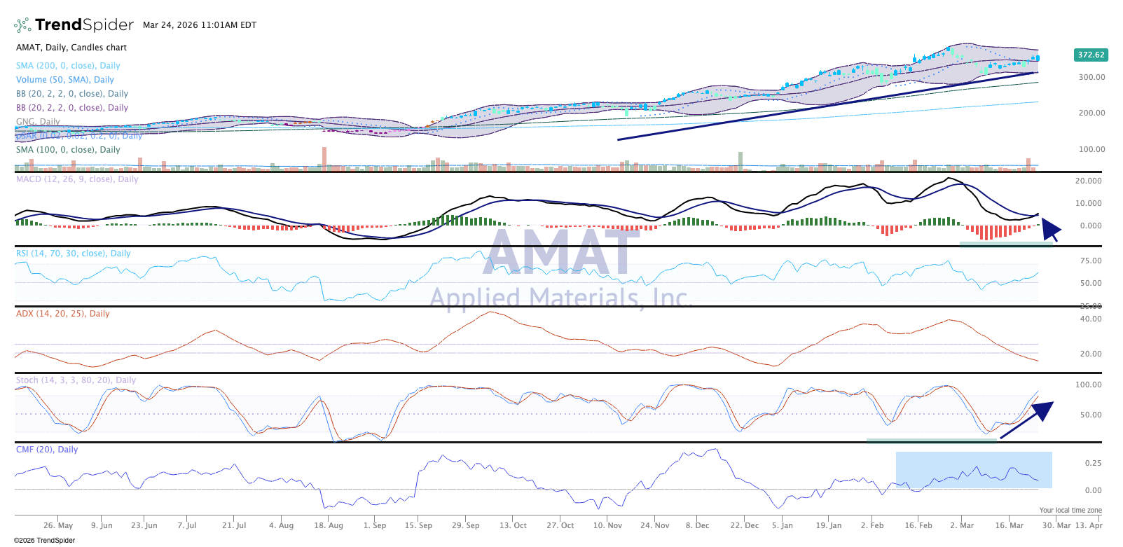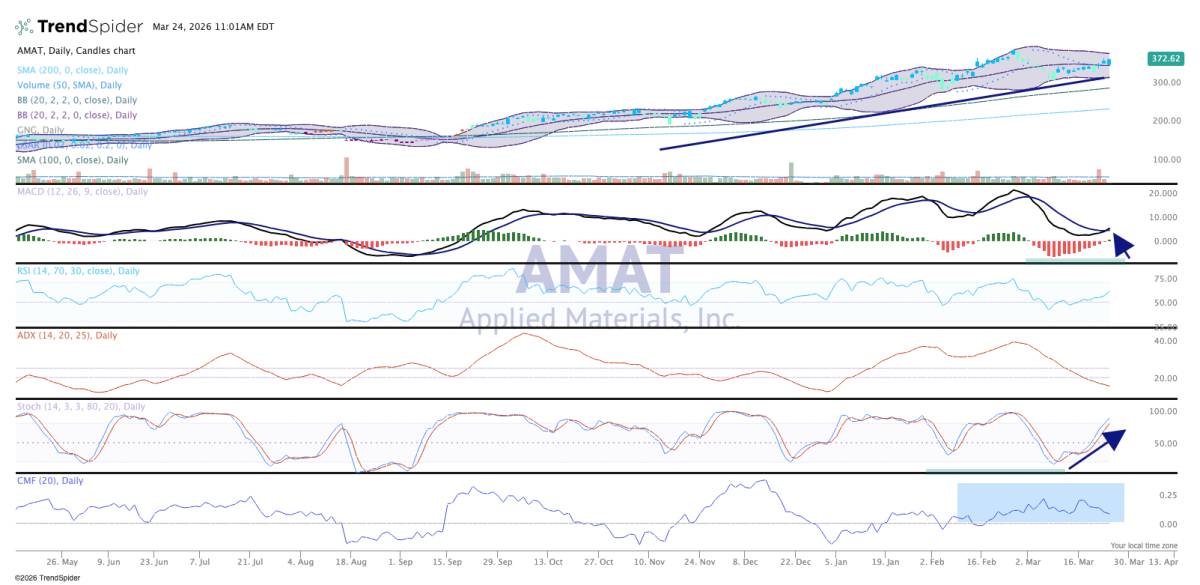 The chart at the top shows blue or teal candles, bullish on the GoNoGo composite of indicators. MACD is just turning up for a new buy signal, so all systems go for higher prices in AMAT.
