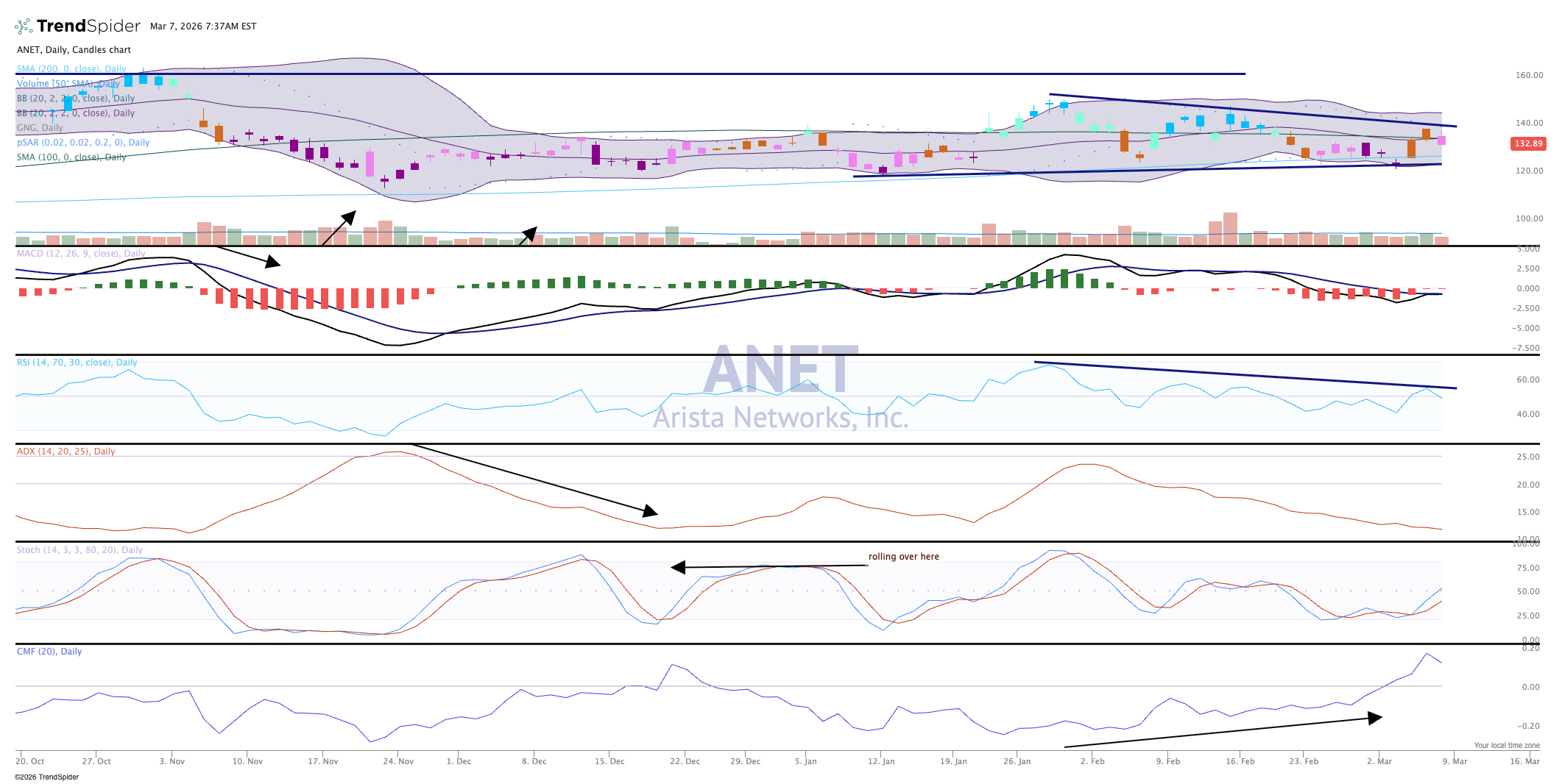 For its part, ANET continues to flutter around a range that covers the $120-150 level. Since breaking down last fall, the stock has been mired in that range.