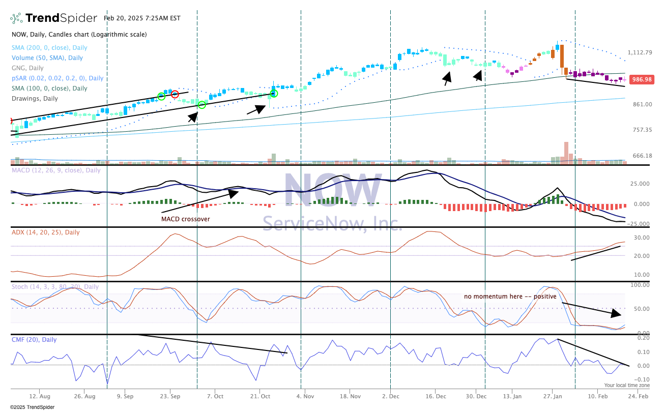 It's been painful to hold ServiceNow NOW as it falls from recent highs. Notable, though, was a double top formed just before earnings were released in January, then a nasty spill that nearly lost all gains from the prior two months. However, the stock landed at the 200-day moving average, which is often very good support from past instances.
