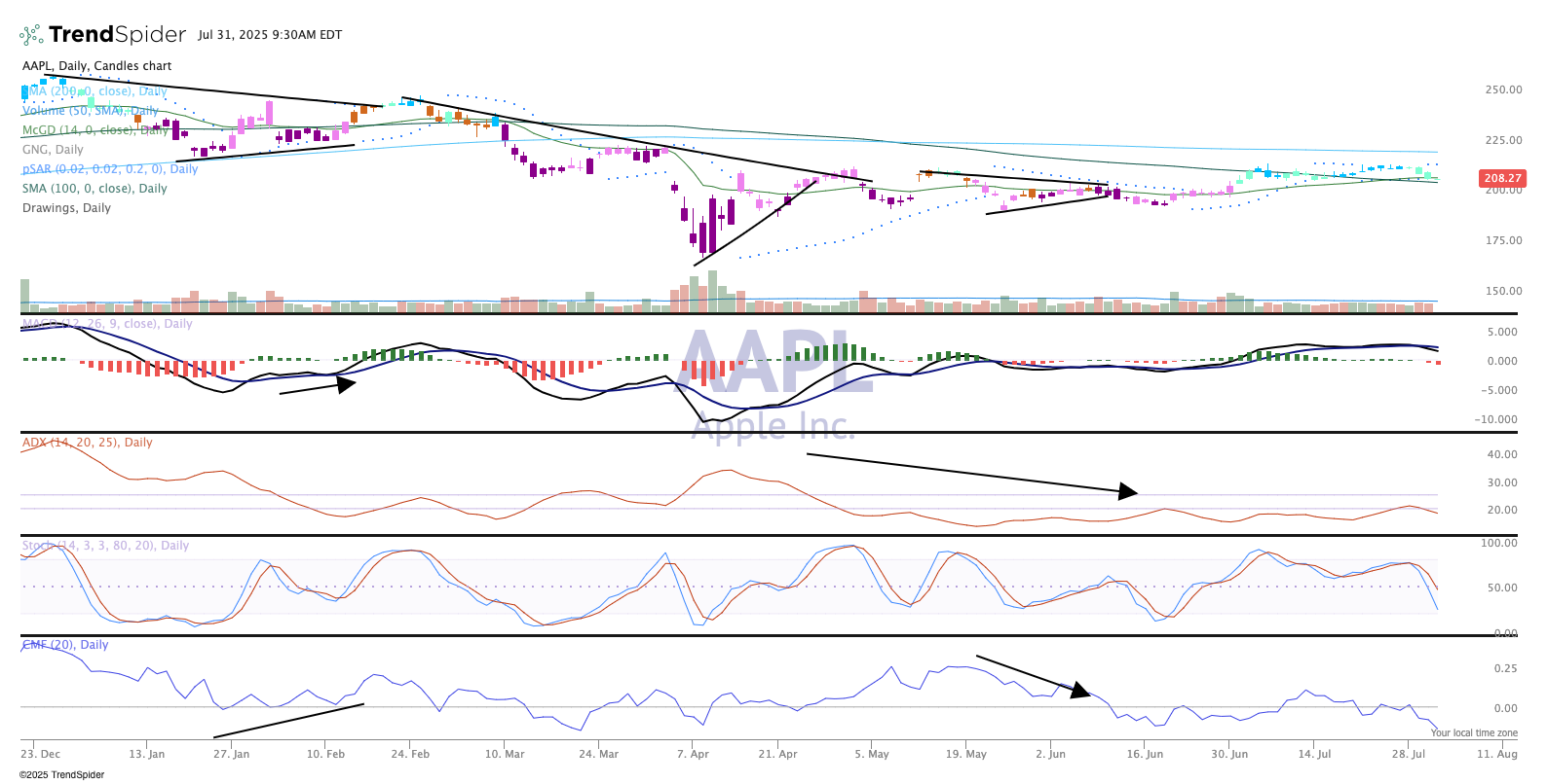 The Apple chart has been improving slowly. The candles show blue or teal, which is bullish on the GoNoGo composite of indicators. Moving average convergence/divergence (MACD) seems to have rolled over, though, to a bearish signal, and money flow just went below zero.