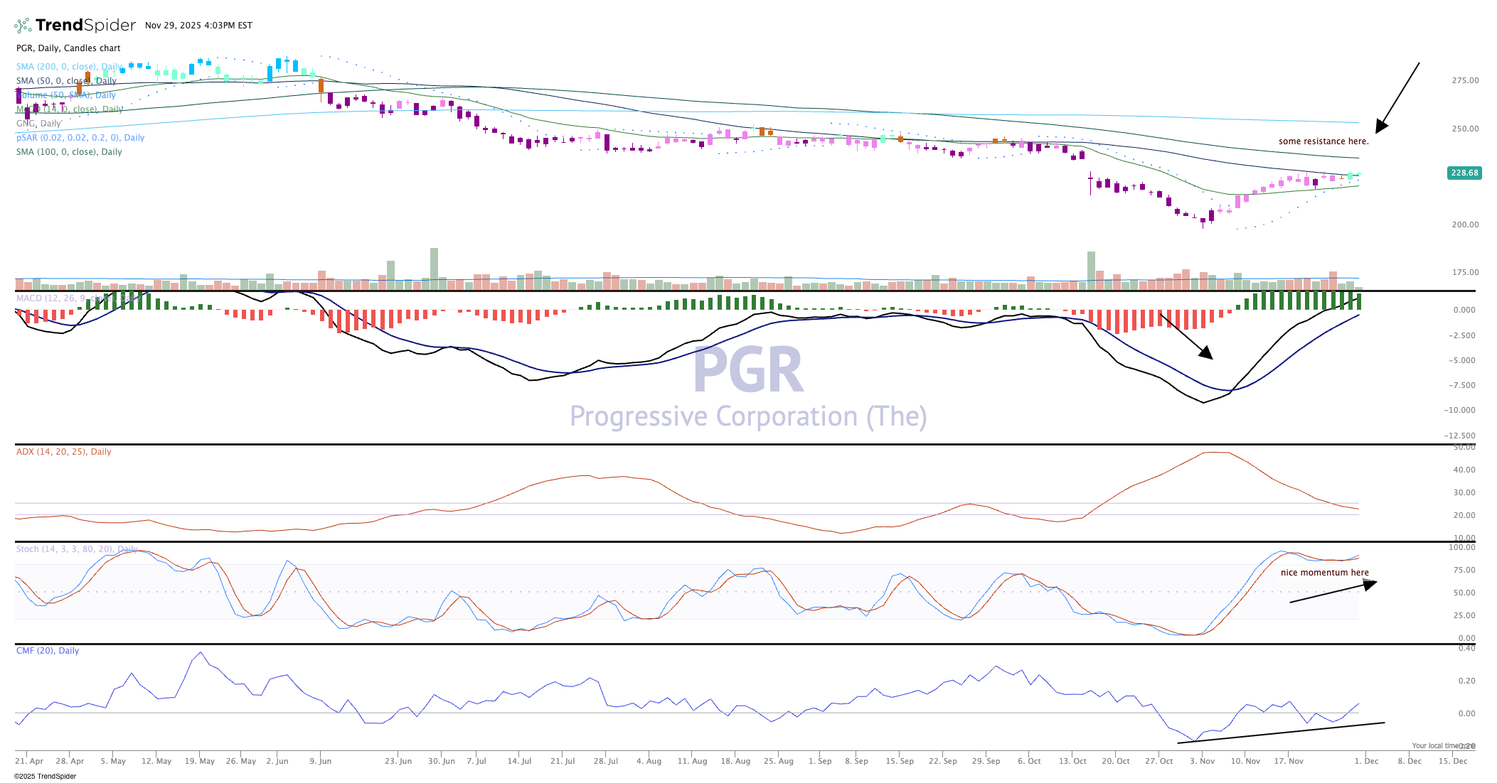 Insurance company Progressive Corp. (PGR) makes the list of Diplomats this time around. With strong earnings and guidance this company has been hitting on all cylinders. That is the positive from the fundamentals, but the chart tells us a different tale.