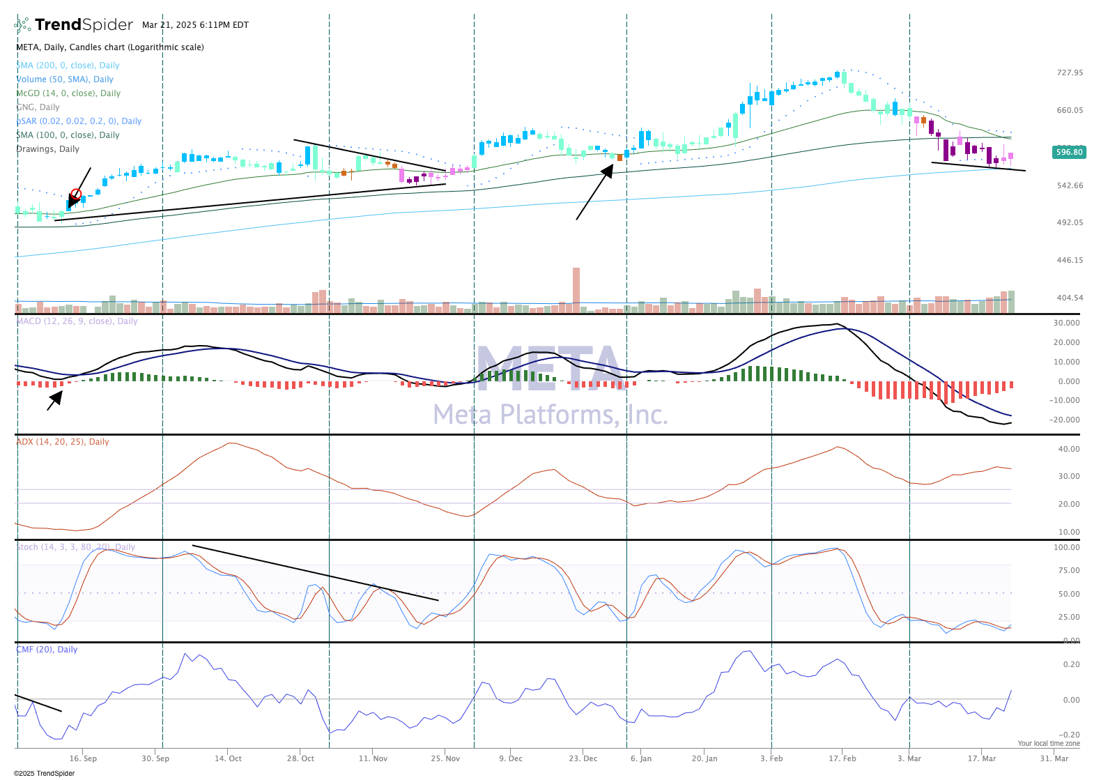Not breaking the 200-day moving average around the $580-$575 level, while likely stymied at the 100-day moving average level around $622. That would frustrate everyone, but build the base that could be the launch point for Meta in the next timeframe.