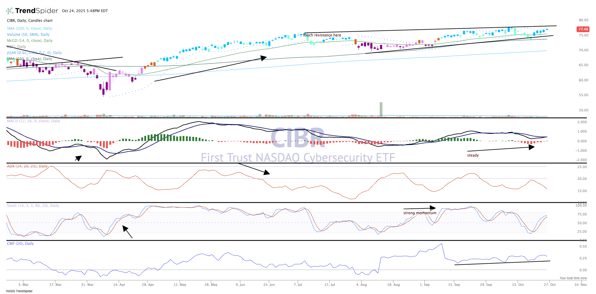 The CIBR ETF continues to perform well as its components make new highs.