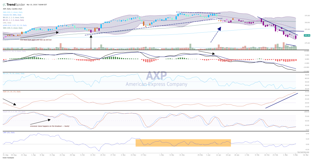 Whether it is AI or a potentially slowing economy (and spending) it appears American Express (AXP) has become the example of the bears' ire. The stock has been punished since peaking in late 2025, falling some 20% on very heavy volume. Each day it seems a new "killer" is going after credit card companies like Visa (V) and Mastercard (MA) , and, of course AXP gets rounded up into that group as well. But the reason why we hold this name in the Pro Portfolio is because it is very different than the others. Remember "membership has its privileges." We think this drop might be a good spot for you to add more shares; we have plenty at the moment.