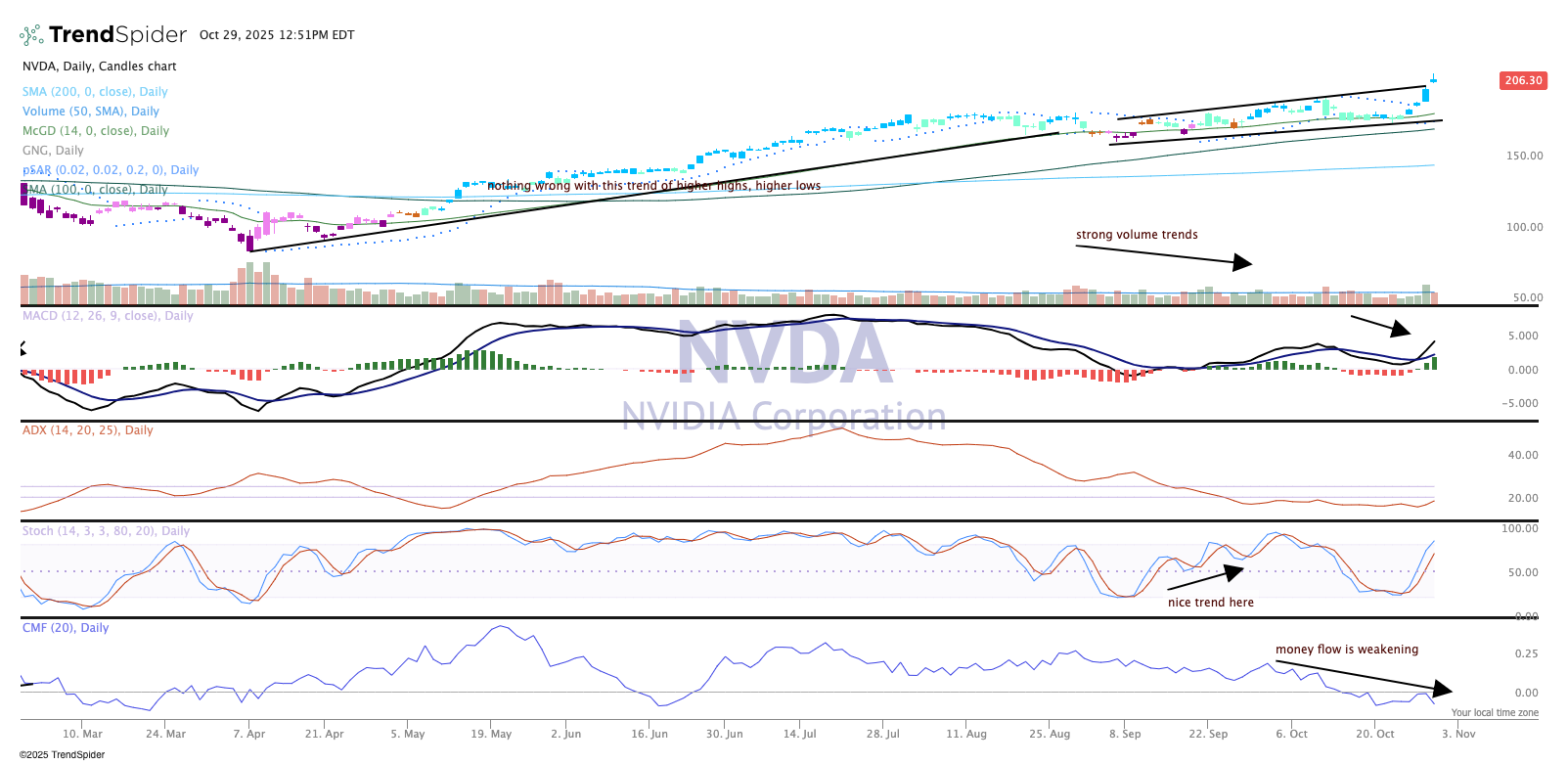 But not all is joyful in Nvidia's, indicators. At the bottom is a red flag — the Chaikin money flow is weak and has now pushed into negative territory. Something to worry about? Maybe not right now as the chart does trump all other indicators, but certainly we have our eye on this.