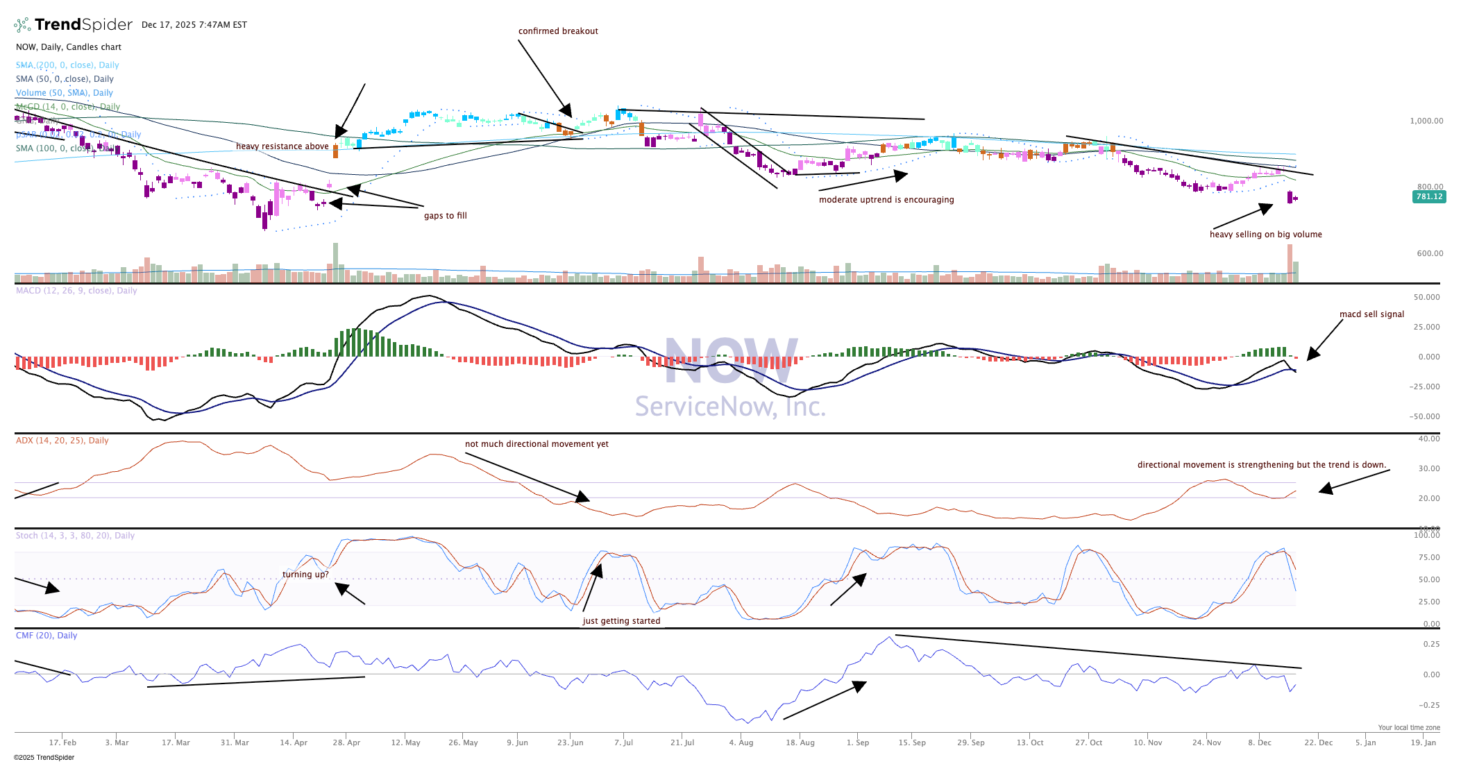 As it is, ServiceNow's chart is quite bearish, now with another sell signal on the MACD indicator and stochastics (momentum) pointing lower. Candles are purple, which reflects bearish on the GoNoGo composite of indicators. Money flow just went bearish, too.