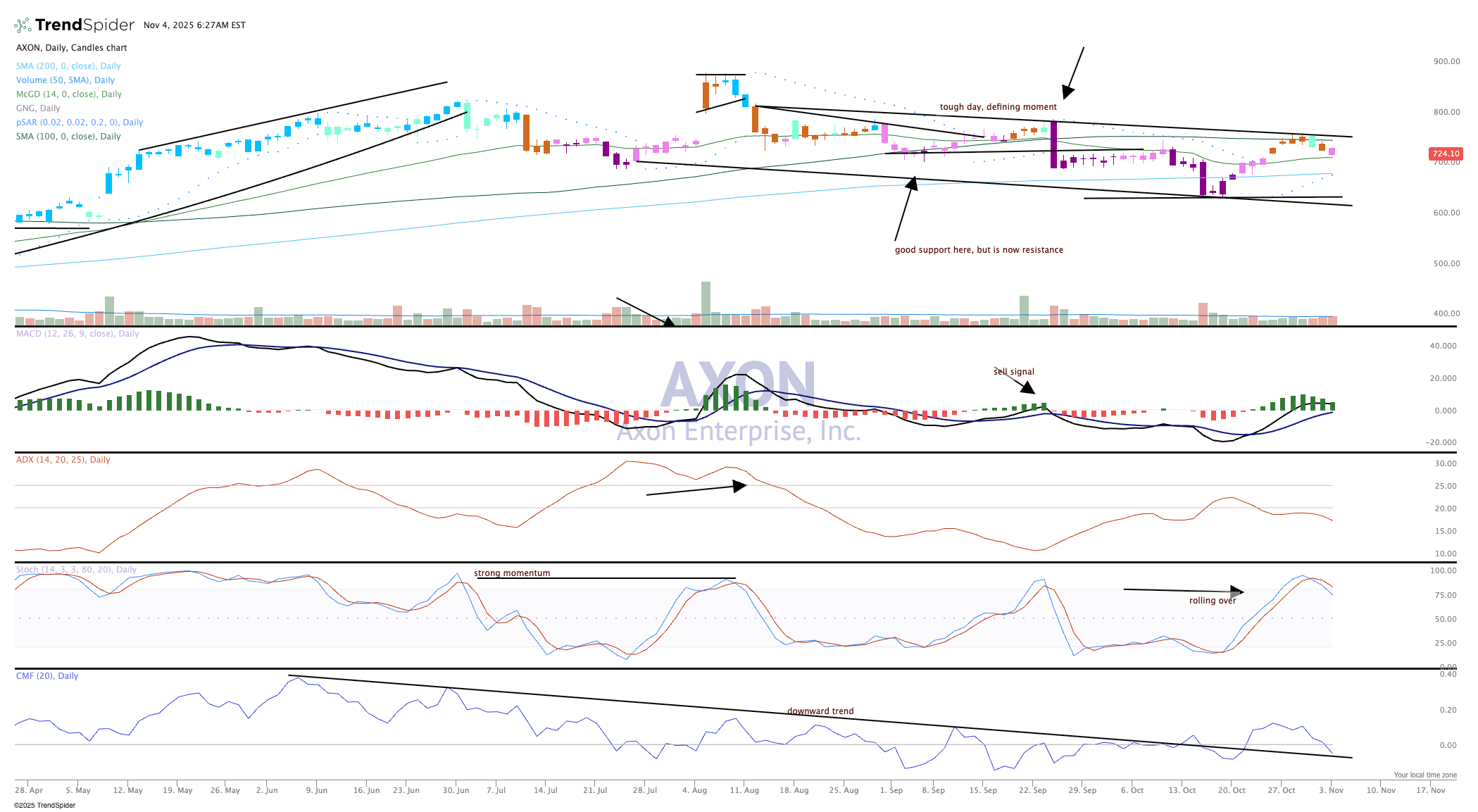 If the line in the sand at just above $600 is not held there is a waterfall decline ahead, way down into the $400's. It is too early to speculate on that outcome, but no question the indicators are bearish.