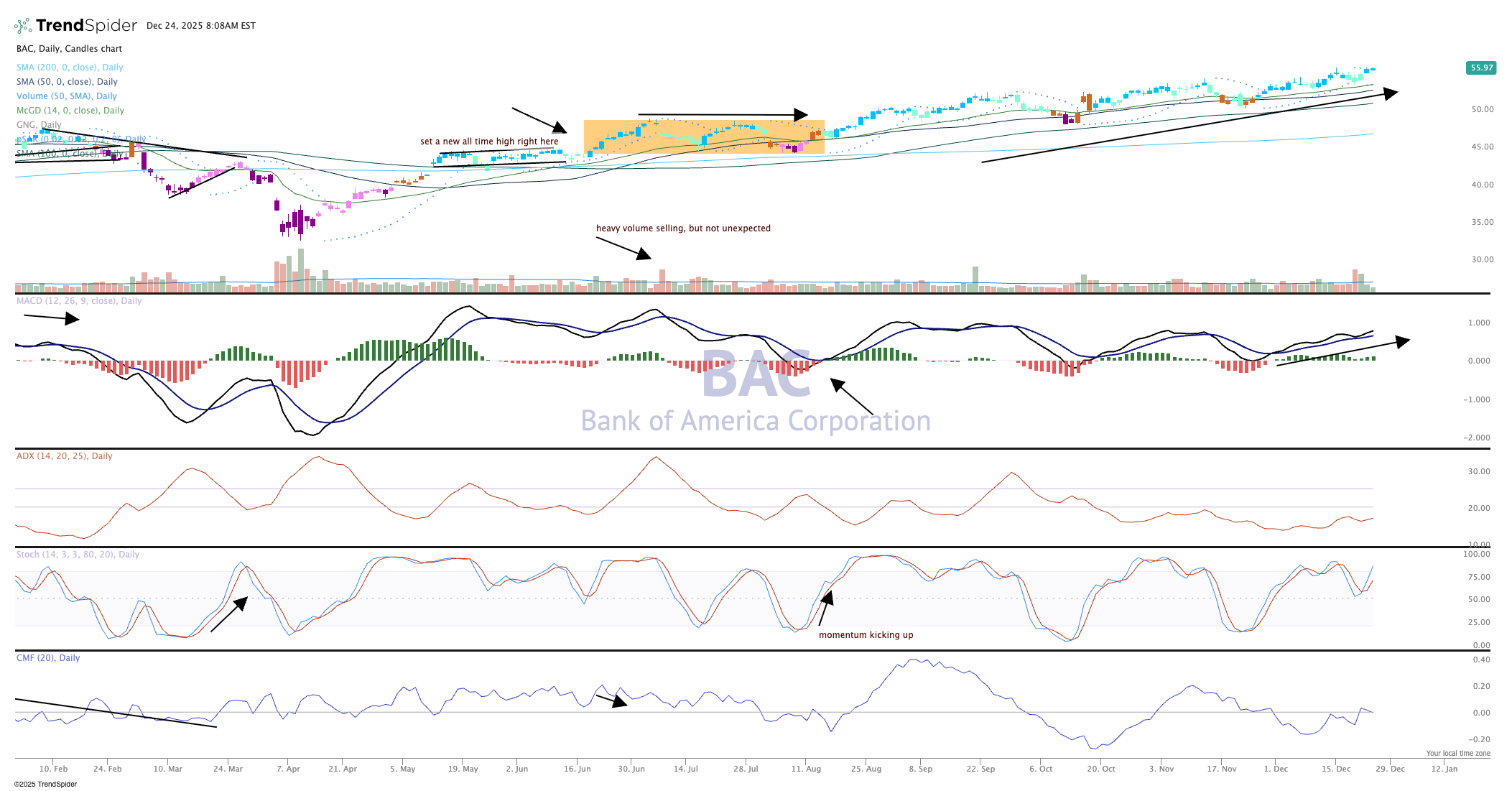 New highs all around for Bank of America (BAC) as the stock continues to perform at a very high level. The chart shows BAC at a new all-time high. Since this past June, the stock has not looked back.