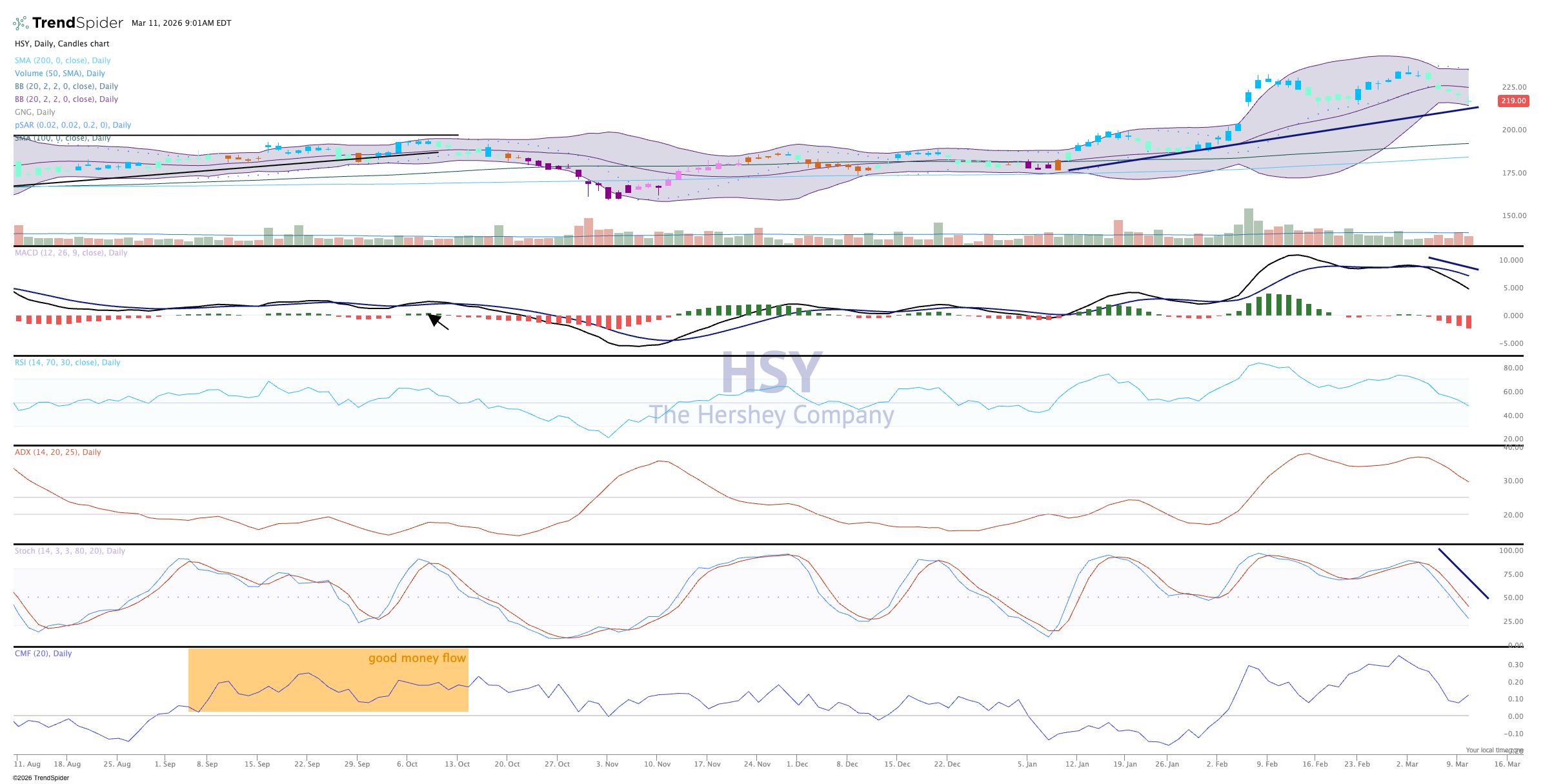 As for the chart, Hershey has been spending a generous amount of time in the bullish camp, with higher highs and higher lows — a textbook uptrend feature. However, the indicators have suddenly shifted downward. Lower levels on the MACD, ADX, money flow and stochastics tell us this current correction is not over. Still, the 50-day moving average is really close by, and that might be the catalyst for the stock to bounce and rise up again.