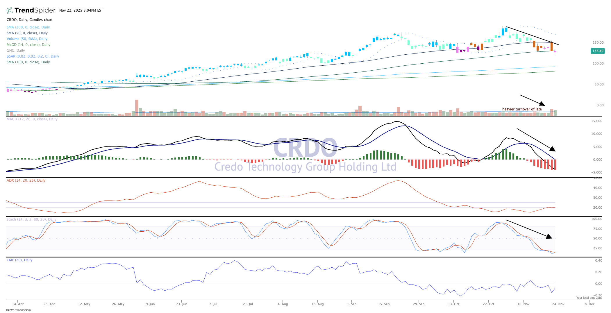 Of course, Credo may stall after a rebound and then we might be stuck in tight consolidation for some period of time, which won't be horrible. In fact, momentum is pointing down, the stochastics are weak, and the ADX is flat, which means the stock is not trending at the moment. The moving average convergence divergence (MACD) has been on a sell signal since Credo fell through the first layer of support about eight days ago.