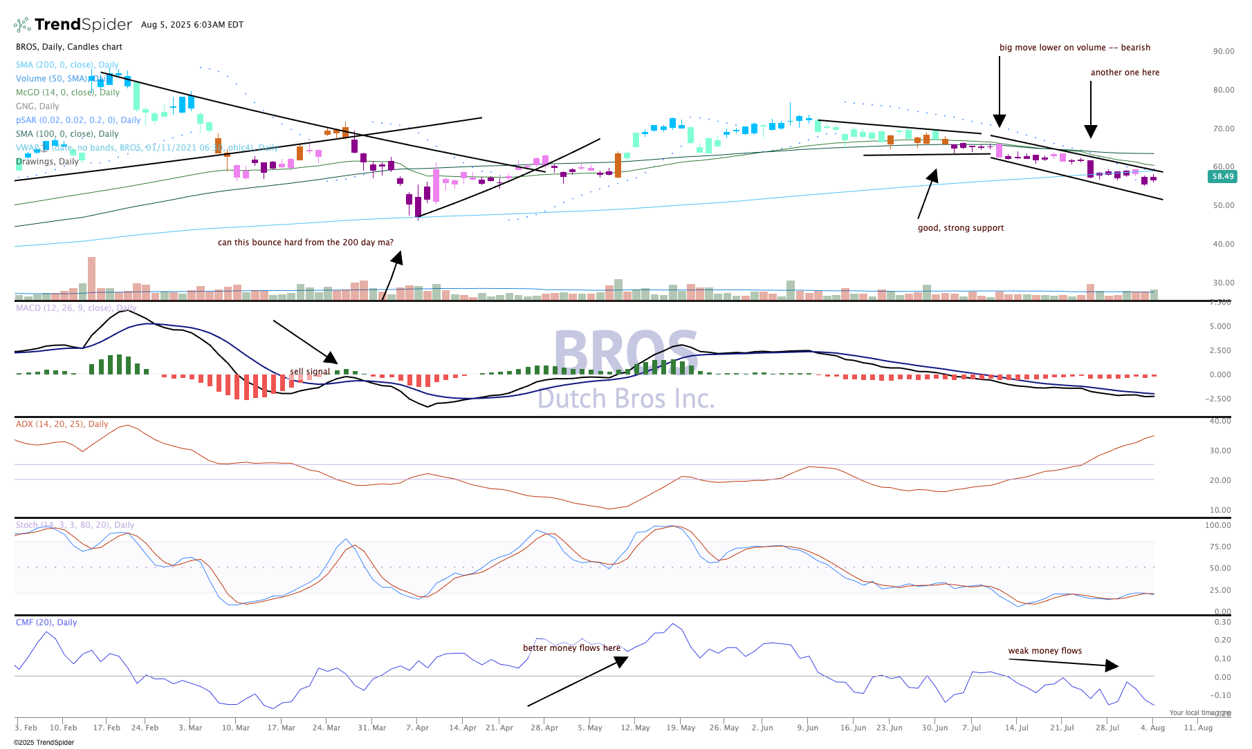 It has been a difficult month for Dutch Bros BROS. The last time we checked in on the stock it appeared to have very strong support at a base that flirted with the 200-day moving average. But we understood that if the stock could not "clear" that base and move up, there was some downside concern. That was evident following a sharp down day in mid-July followed up with another heavy down day just 10 sessions later. That sealed the deal on the trend, which is down as the indicators show supporting bearish signs, too.