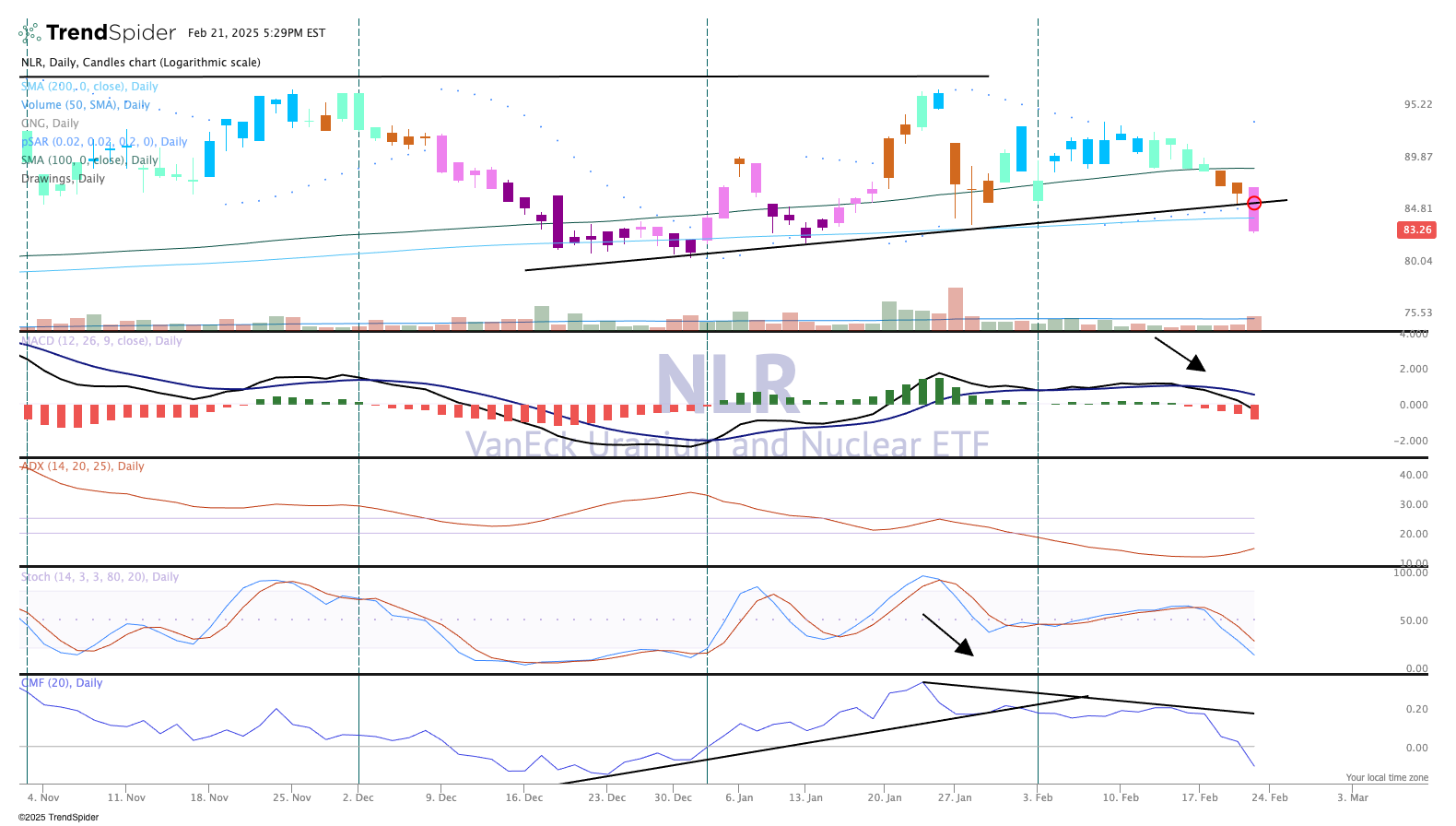 The VanEck Uranium and Nuclear Energy ETF NLR fell sharply on heavy turnover. The ETF, which has some wide ranges and big moves broke a support line (shown in the top pane below) on higher volume than the prior day. That is called distribution, where big money managers are selling the ETF and not returning to buy the stock.