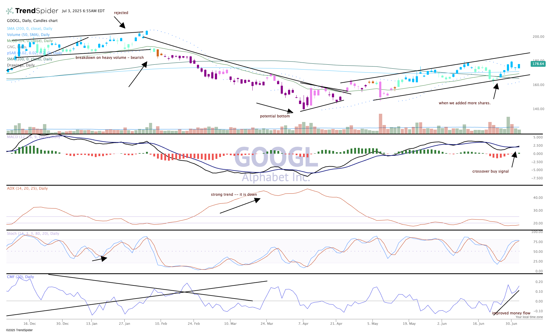 Recently we added more shares of Alphabet GOOGL to our Pro Portfolio holdings at a very fortunate spot, the lower end of the channel (see chart below). Notice the uptrending channel we created here from the late April period. Higher highs and higher lows is our textbook definition of an uptrend. Further, the stock is not yet overbought and not really close to the top of the channel, which comes in about $187.