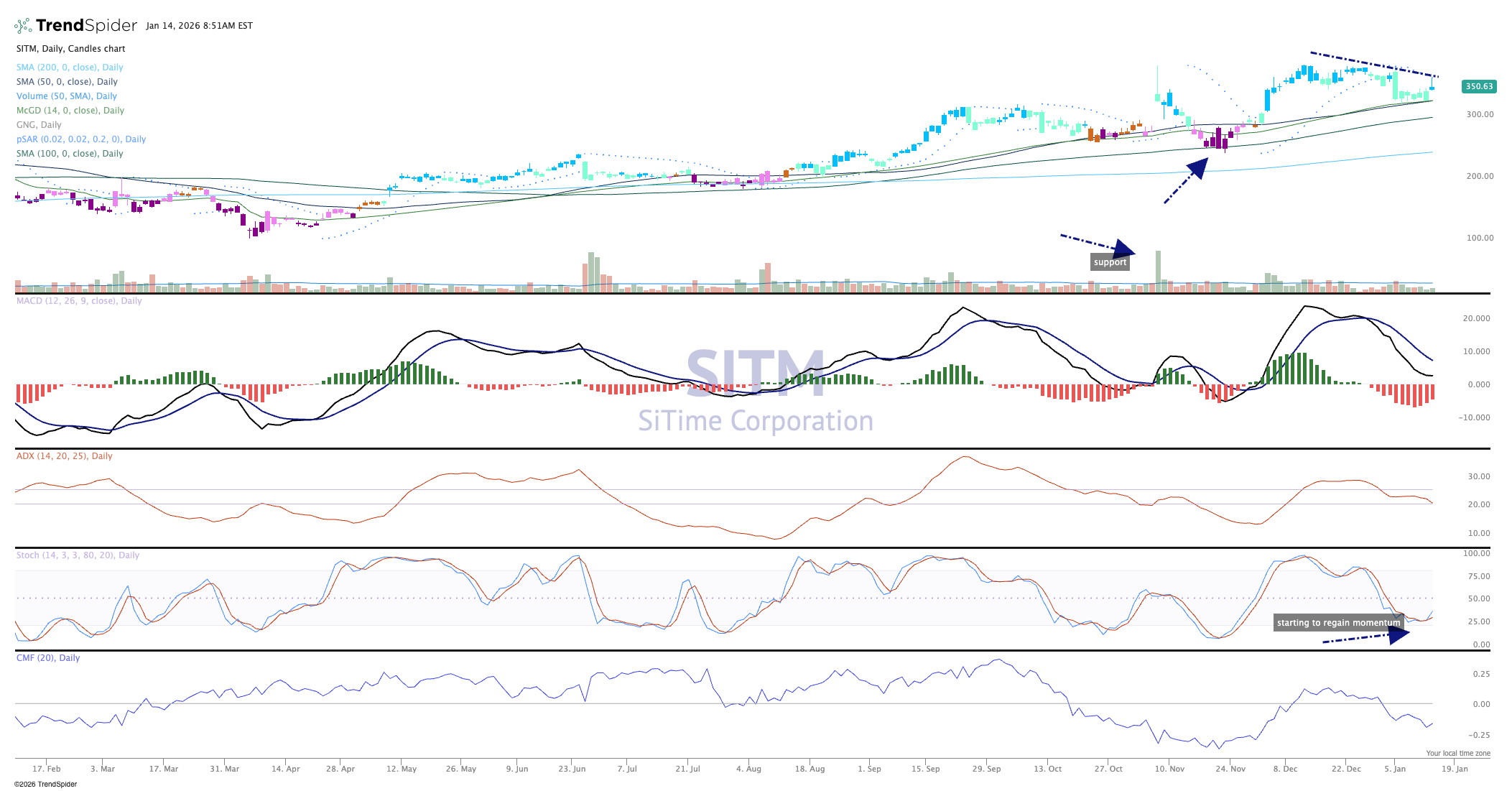But another strong quality of these names, SITM included is we have seen buyers step in on the dips, providing plenty of buying power at levels we would think might hold firm. As we see in the chart below, that happened a few times when SITM dipped to the 100 day moving average. A fiery rally ensued in November, now the stock is simply moving sideways in a wide range.