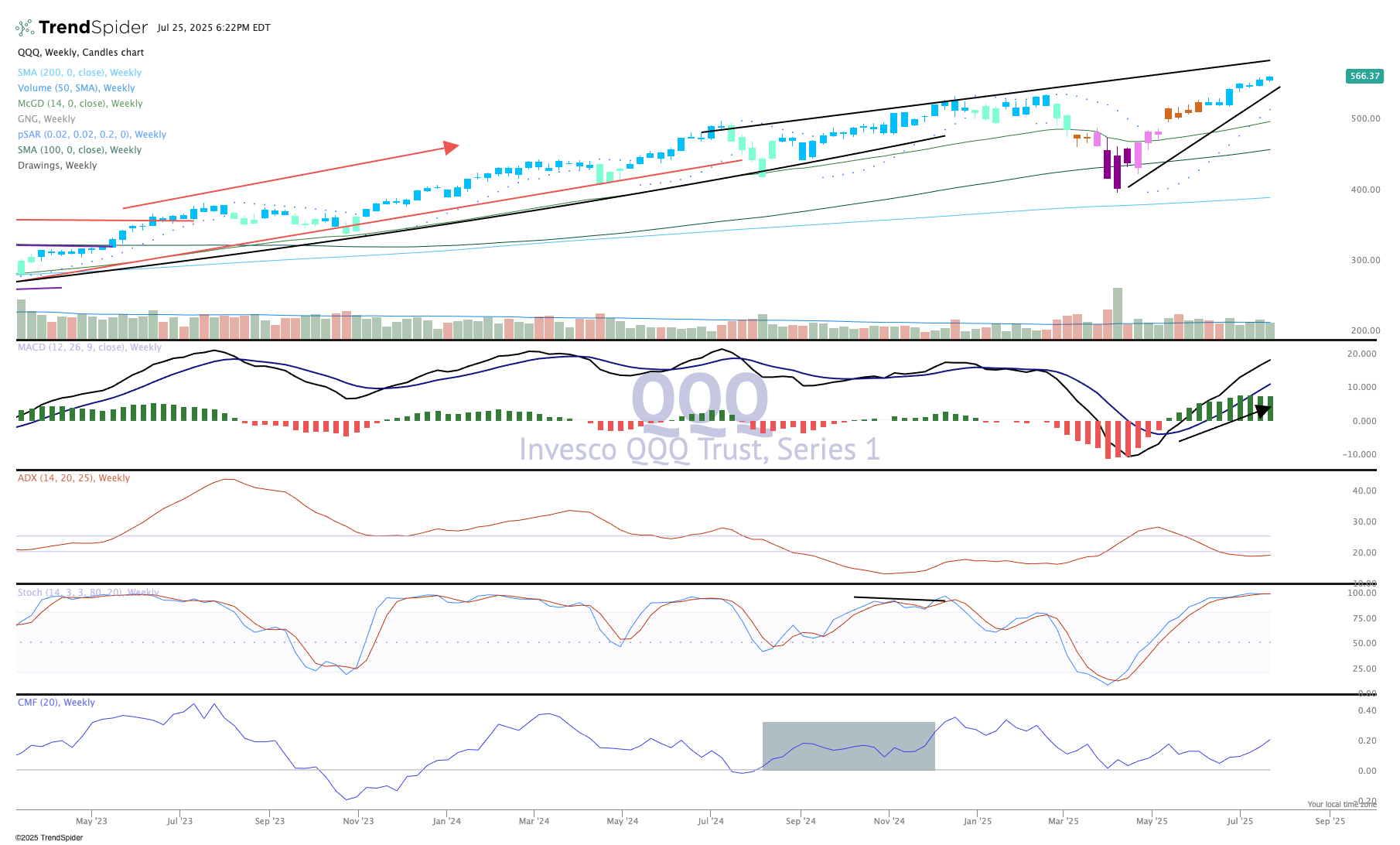 For 2025 the QQQ is higher by 10.8%, a robust gain following up huge numbers in 2023/24. Led by the Magnificent Seven stocks, the Nasdaq is pulling the rest of the market up with it, kicking and screaming.