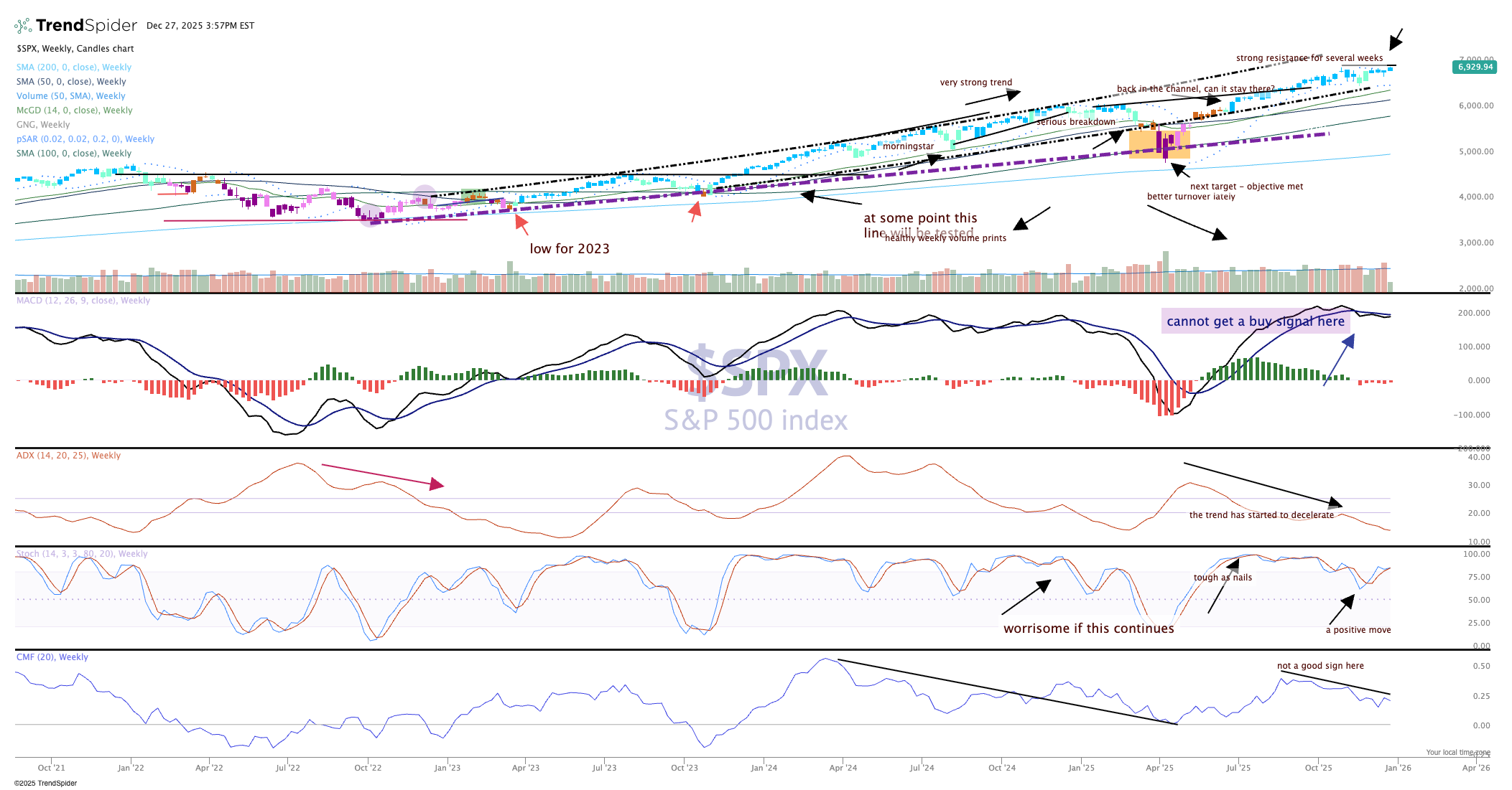 The indicators, however, are telling a different story, with a bearish signal still on MACD and a decelerating trend as signaled by the ADX. Money flow is weak too, and eventually is going to be a problem (but not right now, seasonal trends are bullish).
