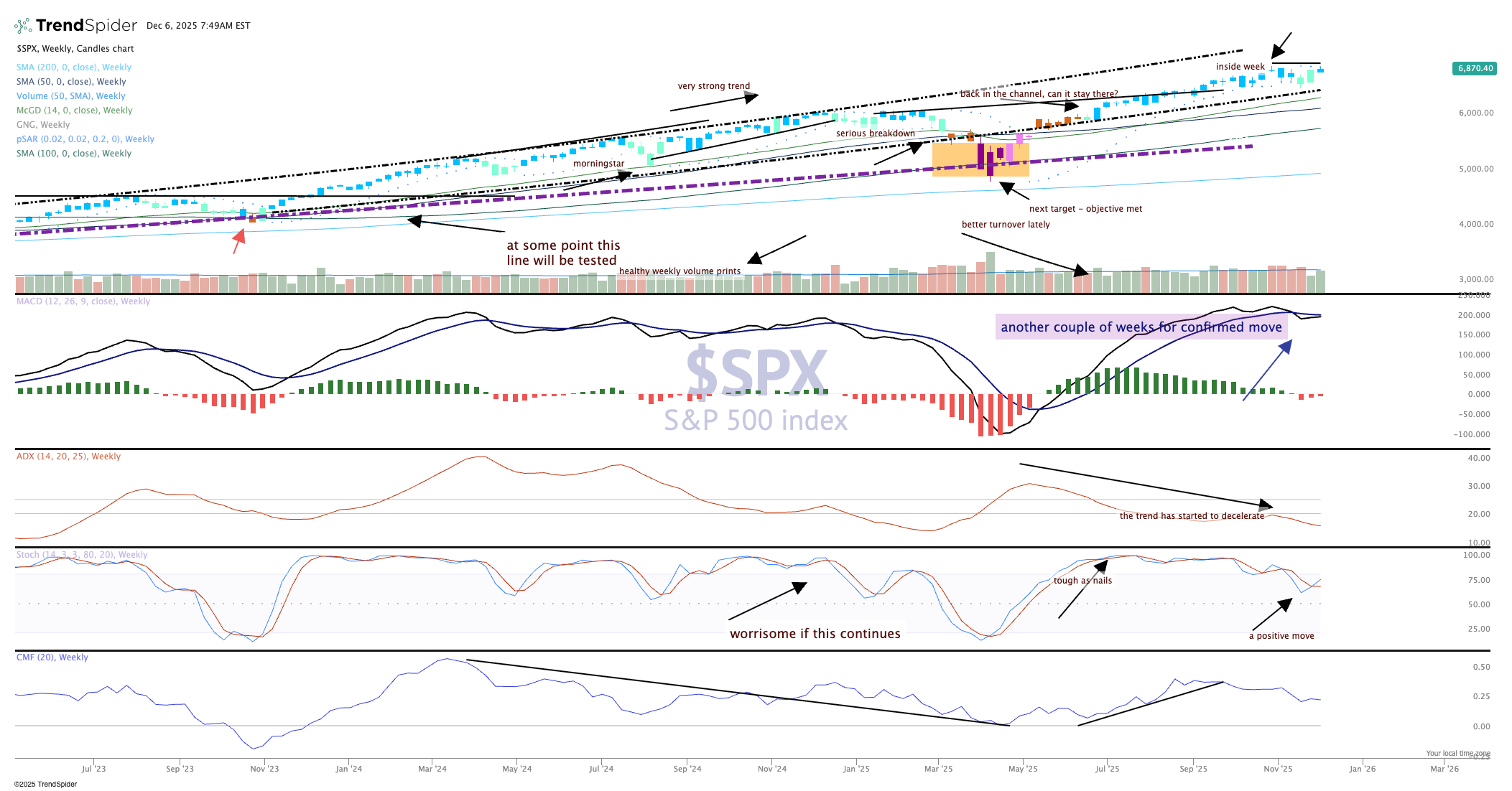 Getting back to bullish trends was important for the S&P 500 index this past week. Notice the change in candle color from teal to blue, meaning the market is now in a strong bullish trend based on the GoNoGo composite of indicators. However, the move seems to be stalling out here, as the ADX (pane 3) has clearly decelerated and is not trending at all.