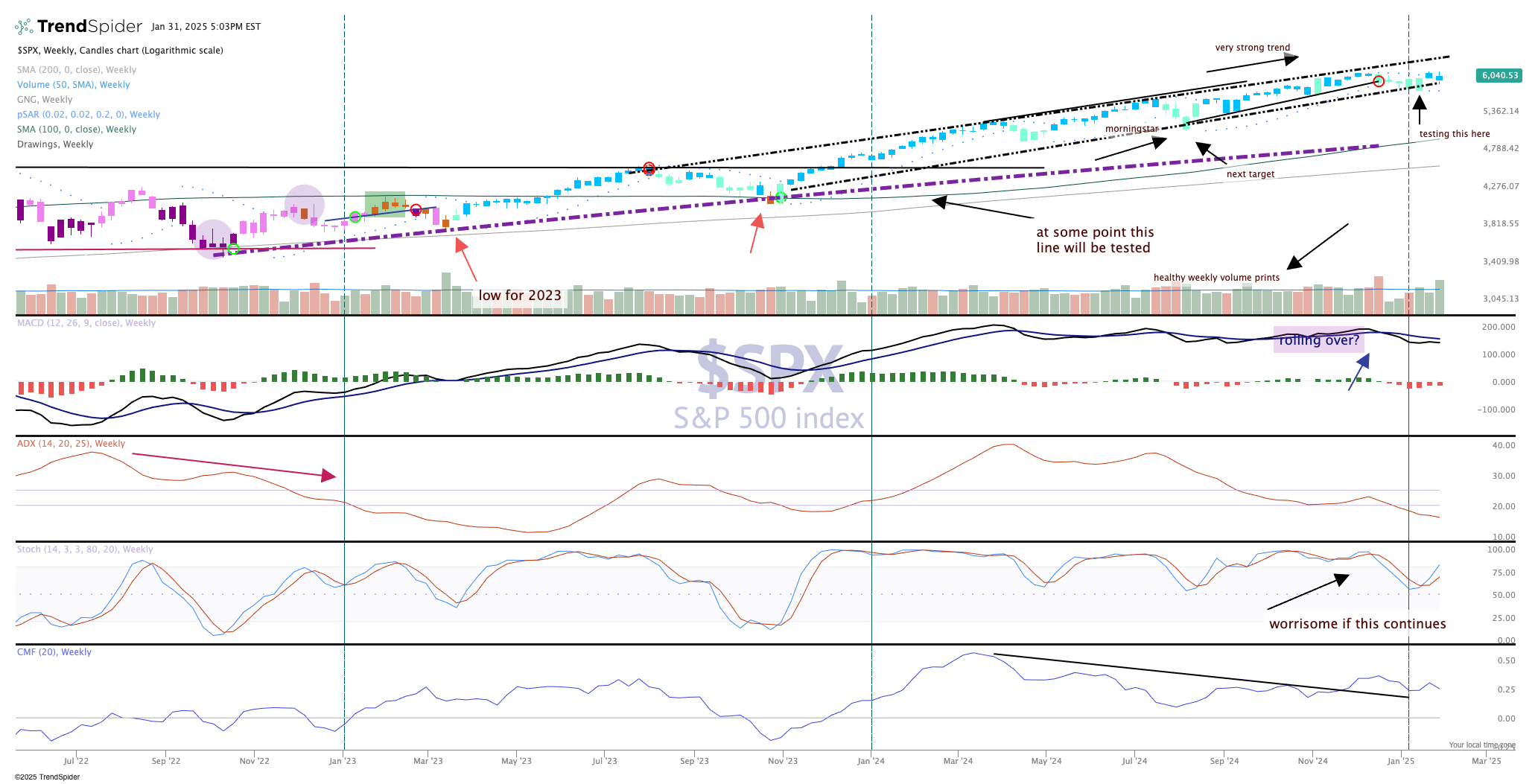 Our weekly chart of the S&P 500 remains bullish, the candles are blue, but if you squint hard you can see the last candle was hardly impressive.