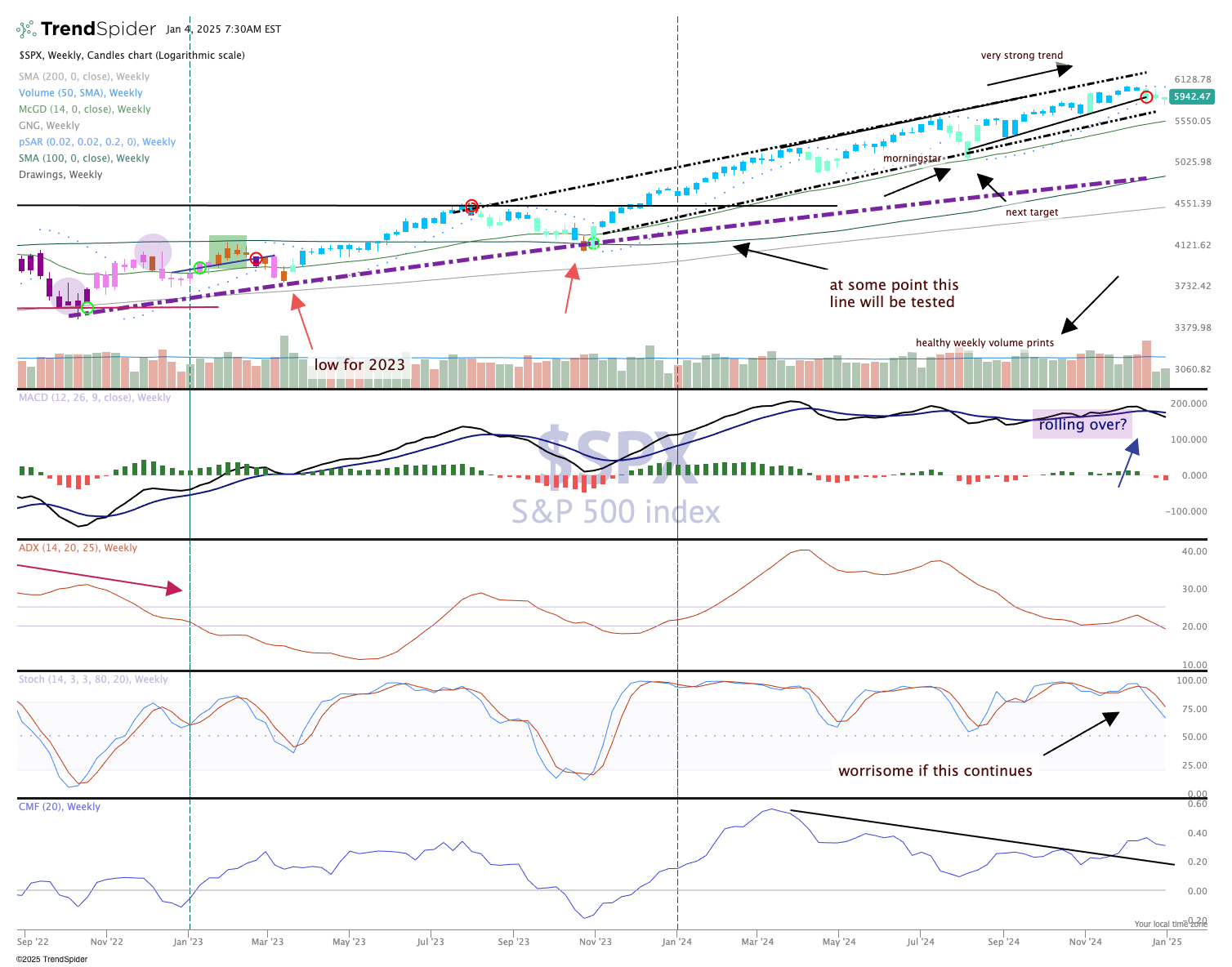 Stochastics remain under pressure. Money flow is fair, but the price action remains in the upward-sloping channel. We'll give the market the benefit of the doubt, especially with earnings season coming up, which is often a bullish period.