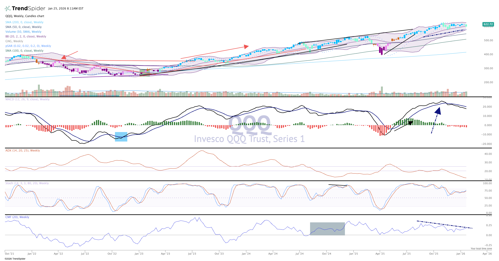 Today we'll look at the Nasdaq 100 through the Invesco QQQ Trust (QQQ) weekly chart. Many names in this big index will report earnings over the next couple of weeks and it serves us well to focus in on this group from time to time. After all, the Magnificent Seven are always in the spotlight, and with three of those names reporting this week (Tesla (TSLA) , Meta (META) , Microsoft (MSFT) ) we'll have a good idea how much the investing public appreciates these companies.