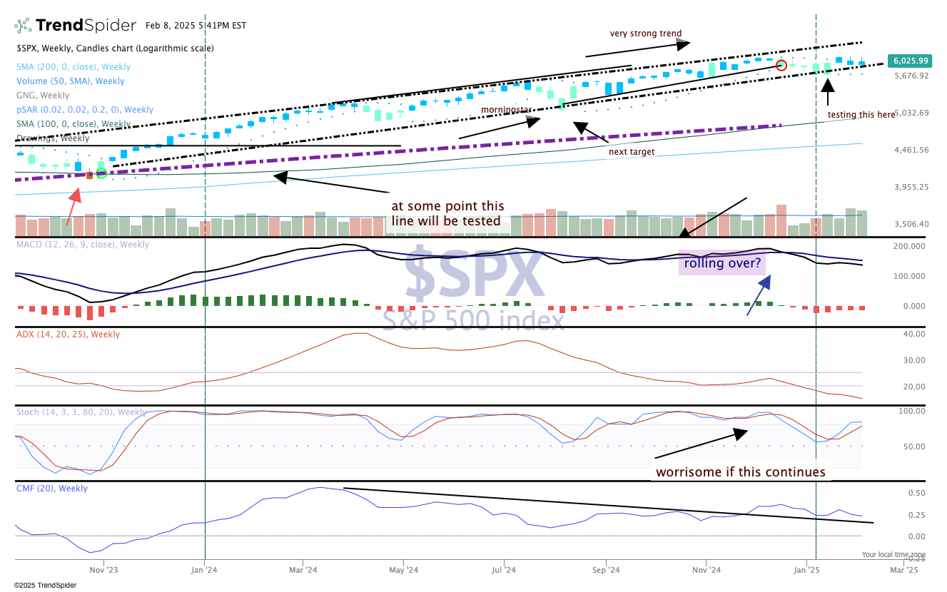 A strong start to February may have lost its buzz, and that comes on the heels of a very hot month of January. Stocks are pulling back and may be looking to break the tight channel we have drawn in the top pane of the chart below.