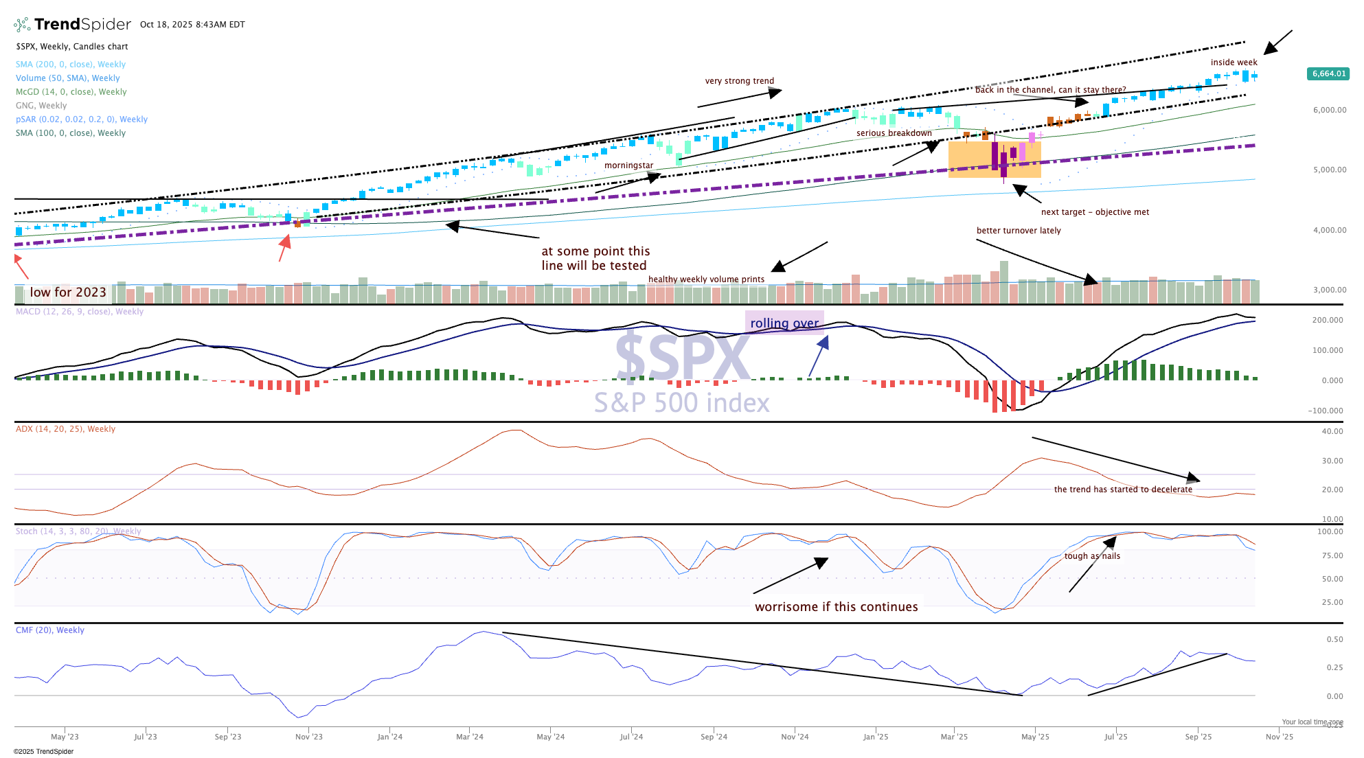 An inside week means the market is consolidating gains but not breaking down below that might establish a downtrend pattern. We often see these consolidation moves after a large run-up; traders/investors establish a zone or area where buying and selling happens more frequently in a narrow range.