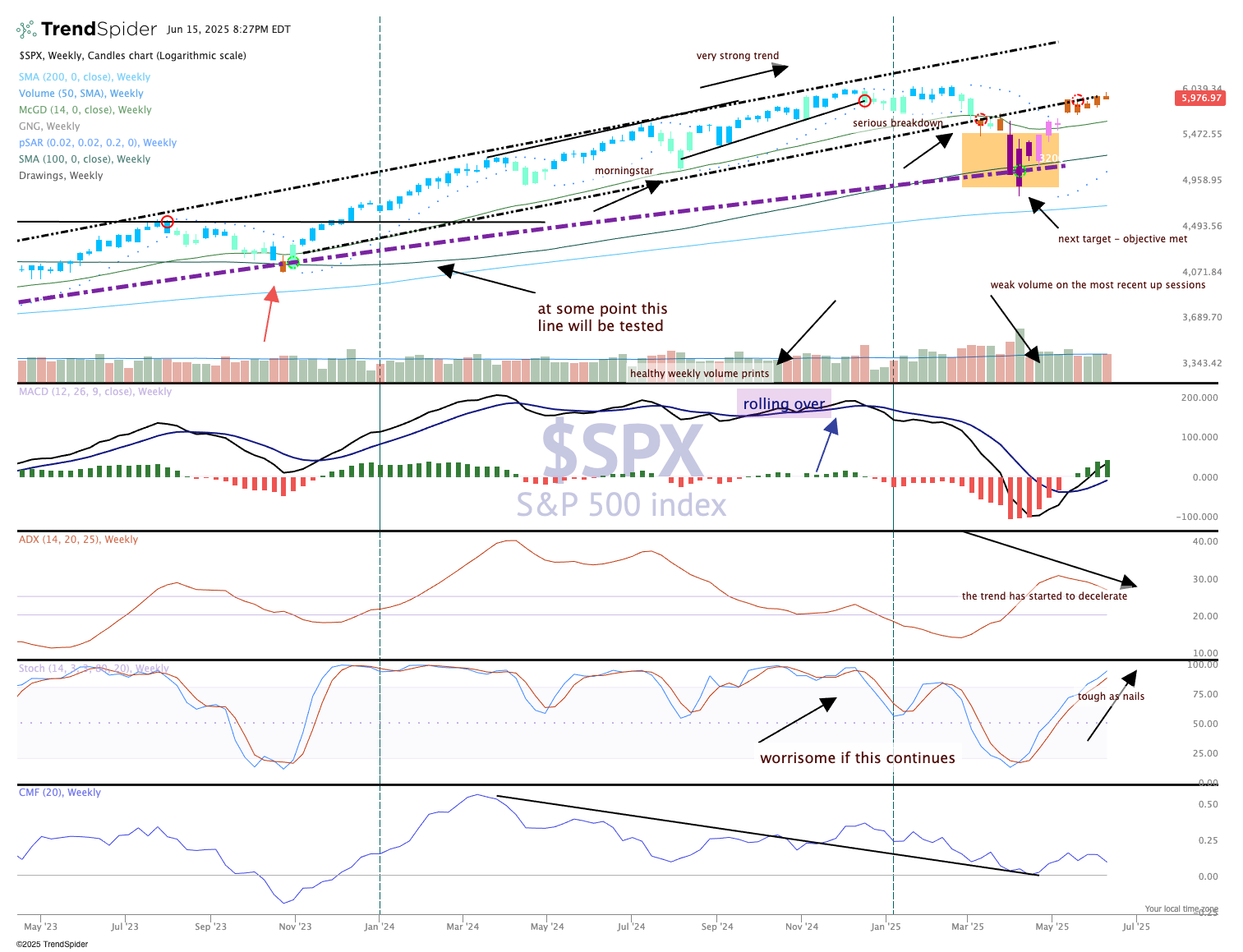 Remember, signals are what we take while conditions are simply observed as we get ready for the signal. For all intents and purposes the stock market has been overbought for a few weeks as the bulls try to rally into the "safe zone" of that uptrend channel shown below.