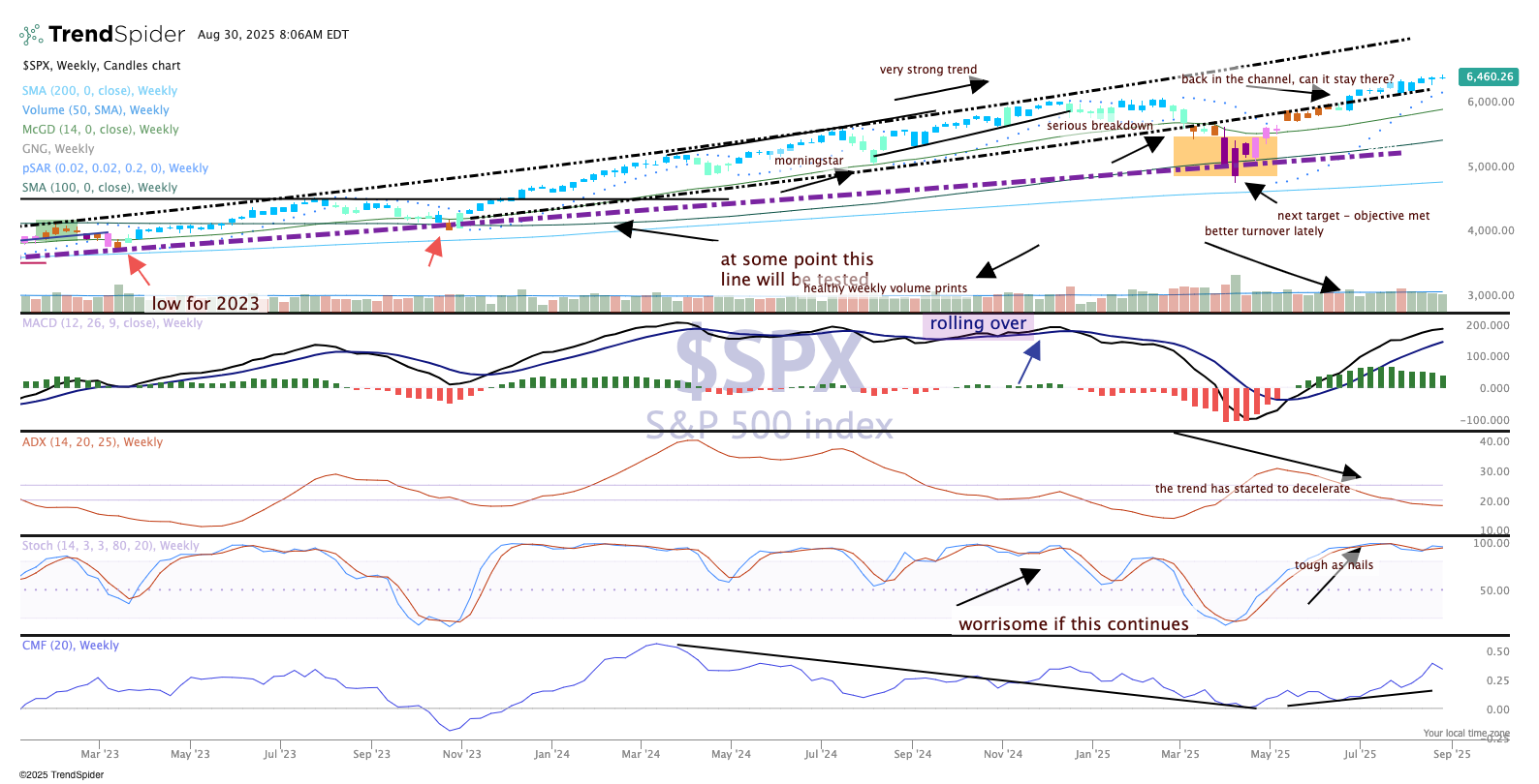 There has been no stopping this bull market since it started charging higher in mid-April. There have been a series of higher highs, higher lows AFTER it tested that long-standing purple trend line (in the top chart), but now the weight of evidence is on the bulls to continue this run. The challenge here is to get past September with as little damage as possible, but the chances of a sharper downturn are much greater than in August.
