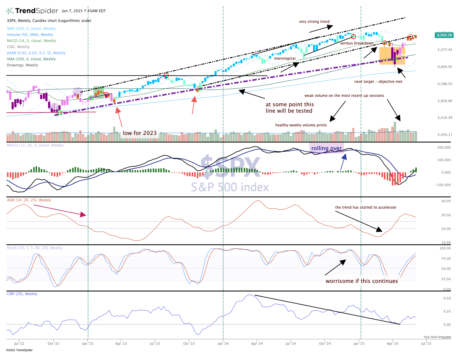 The weekly S&P 500 shown is still trying to get back into the channel.