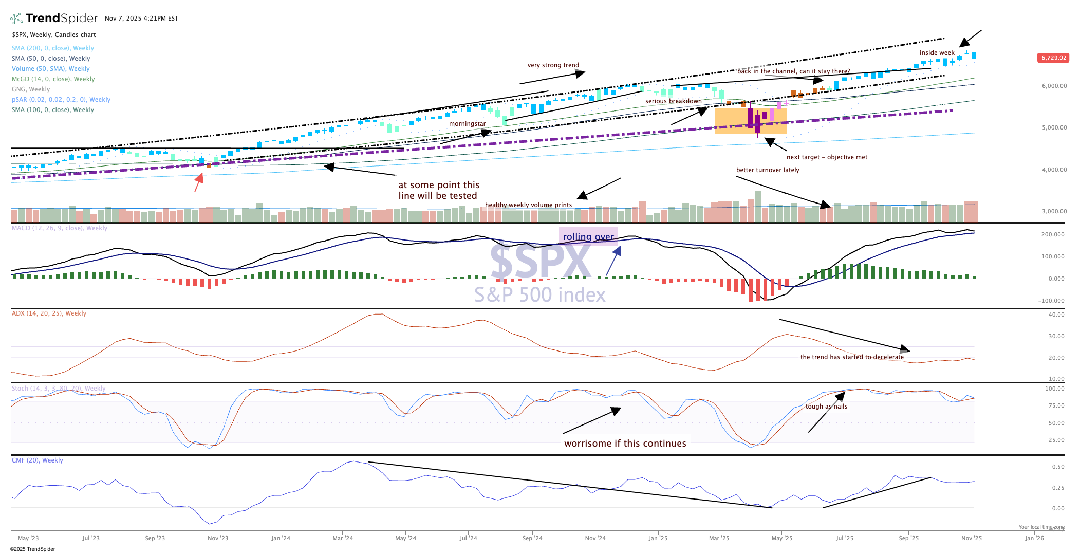 Stochastics (momentum) is starting to roll over, and while the parabolic SAR (stop and reverse) remains bullish, this indicator is looking to turn downward for the first time since May.
