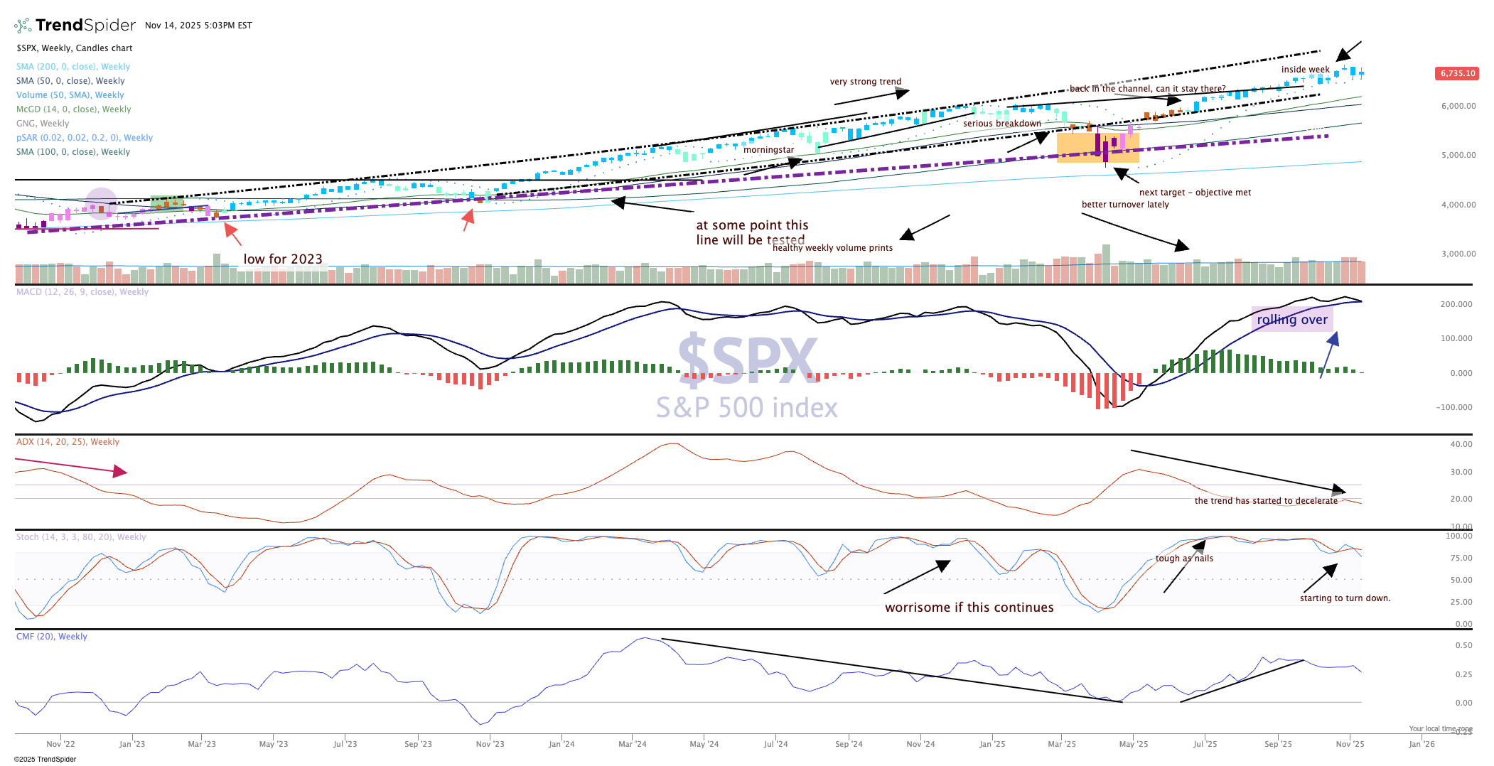 As we can see in the second pane on the chart, the Moving Average Convergence Divergence is starting roll over here for the first time since a serious breakdown occurred in January and then in April. Not on the bulls' bingo card, for sure.