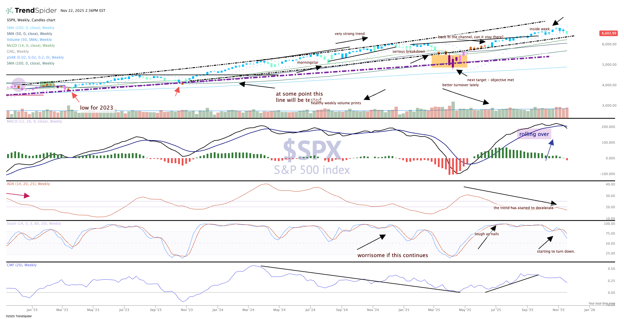 The bottom of the long trend channel (dashed lines) are still holding support, but barely. We cannot give the markets the benefit of the doubt any longer, though we could see bullish action this week the volume trends will not be bullish. Time to be careful until the end of 2025, play it close to the vest.