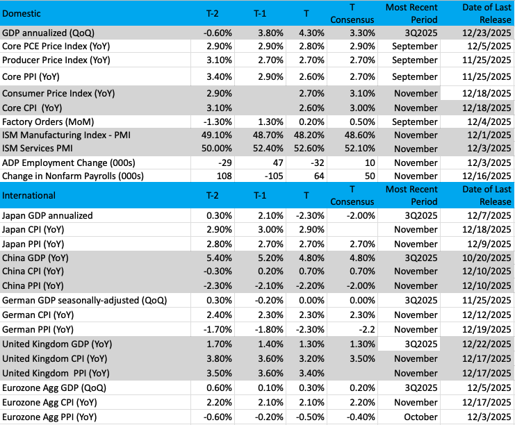As of now, the calendar for Fed speakers is practically nil, but that can change, so we’ll be taking a fresh look at that early next week. Because the Fed enters the blackout period on Jan. 17 for its Jan. 27-28 policy meeting, the window for those speakers is limited. For our money, we’re inclined to listen to the Fed speakers we do get once the December Employment Report is published on Jan. 9 and even more so once we have the December CPI and PPI reports on Jan. 13 and 14.