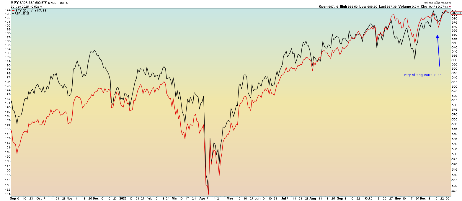 No question the index is bullish, with higher highs and higher lows in place. That is our textbook definition of an uptrend. For 2025, the SPY is up roughly 17% while the RSP has gained about 11% for the year. The difference is likely in the excess performance of those above-mentioned Mag 7 names, which have a strong influence on the SPY. The RSP performance is terrific and is on par with its average return over the last 10 years.
