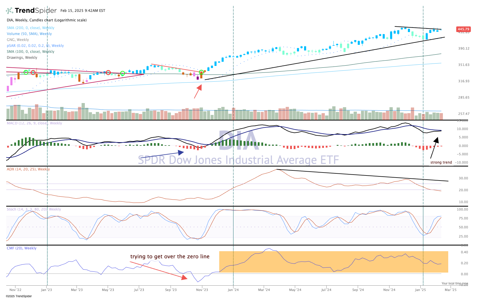 Money flow remains robust and has been bullish since late 2023. The trend in the DIA is clearly bullish: the candles on this weekly chart have been blue or teal (bullish) since late 2023. Volume trends are bullish as well, and while it appears the index has run into some resistance, the all-time highs are just 1% away from current levels, which can be achieved in a day or two.
