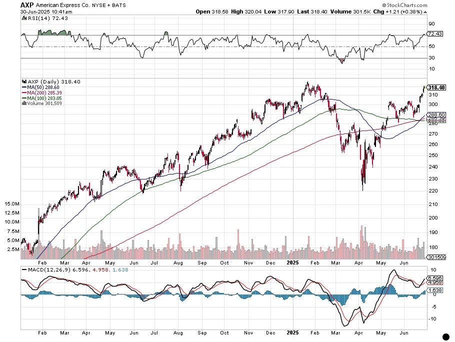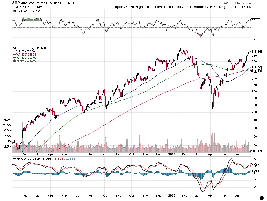 In keeping with our comments this morning about the McClellan Oscillator, we could see AXP melt up higher in the near-term, which would likely push their relative strength index higher from the current 72.57 reading, and deeper into overbought territory. Should that happen, the prudent move would be to lock in some of those big AXP gains.