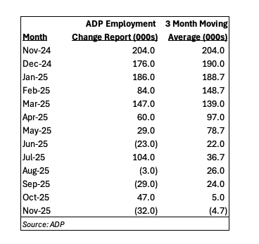 While October’s jobs figure from ADP was revised higher to 47,000 from the initial 42,000, when we look at ADP’s data over the last year on a three-month moving average, there is little question when it comes to the dramatic slowdown in private sector job creation.