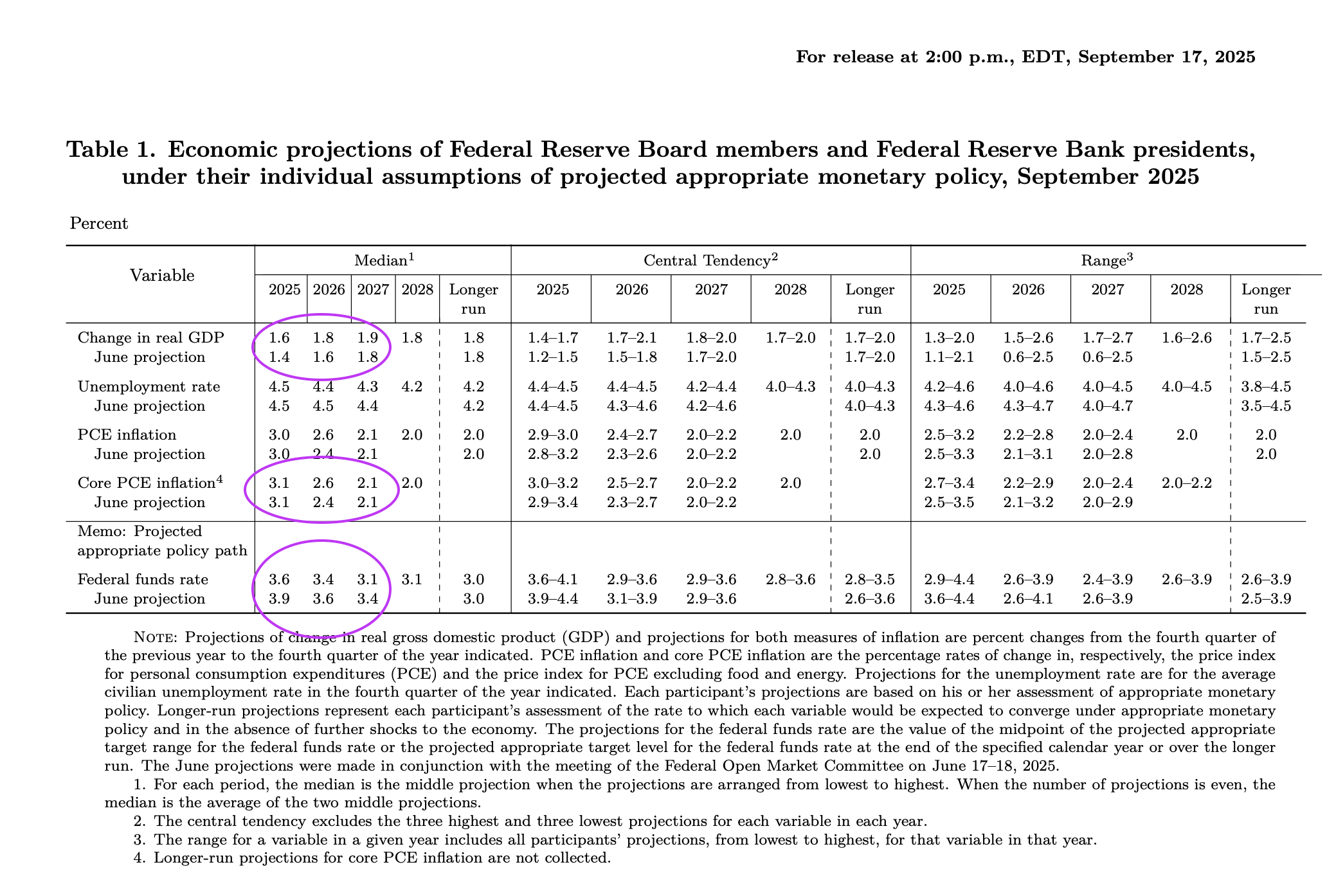 However, in looking at the updated set of economic projections (SEP) for 2026, the Fed currently sees just one additional 25 basis point rate. Bottom line: While the Fed sees one more rate cut than it did in June, the central bank does not see the need today to telegraph six 25 basis point rate cuts. That helps explain the relatively muted reaction we’re seeing in the market.
