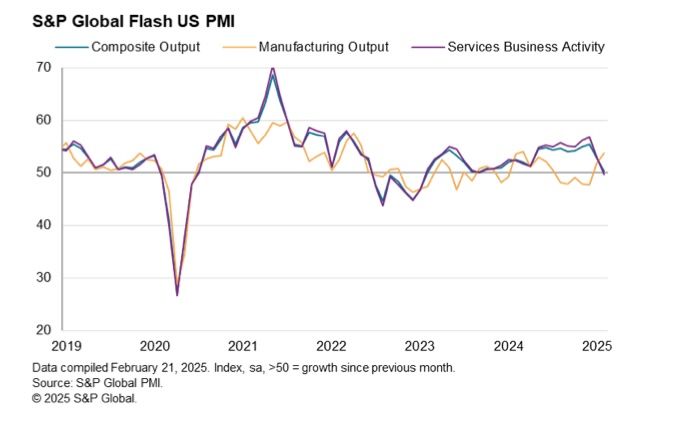 Our view has been the February Flash PMI report from S&P Global would be revealing with what it says about the pace of the economy, inflation pressures and initial reactions by companies to Trump tariffs, as well as ones in response to those measures.