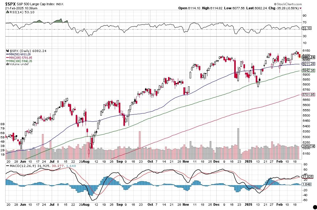 On Thursday, we discussed several issues that were already flashing yellow lights for the market, and the Flash February findings are in that camp as well. At a minimum, the report will increase uncertainty in the market. Fortunately, we have our cash on hand and our inverse ETF positions that help insulate us from the volatility it will bring with it. The next level of support for the S&P 500 is near 6,011, just over 1% lower than current levels. After that, it’s near 5,942, about 2.2% lower.