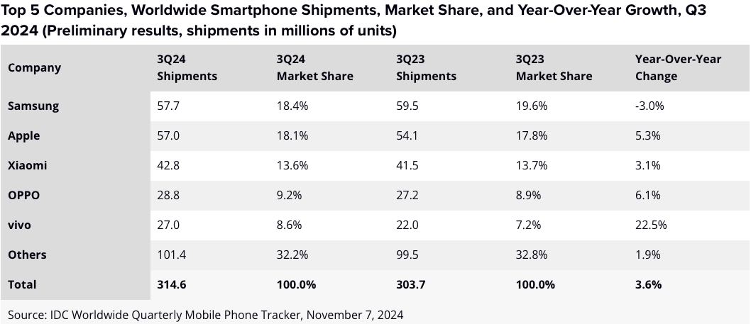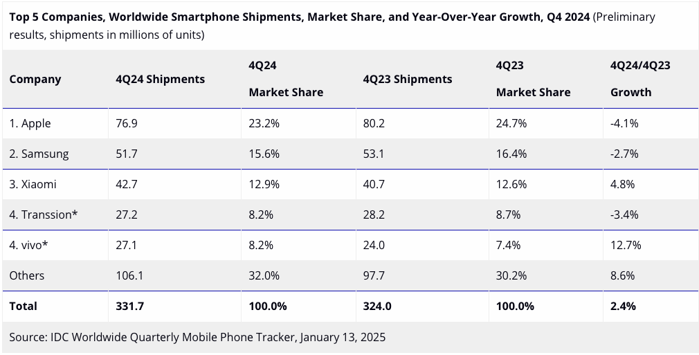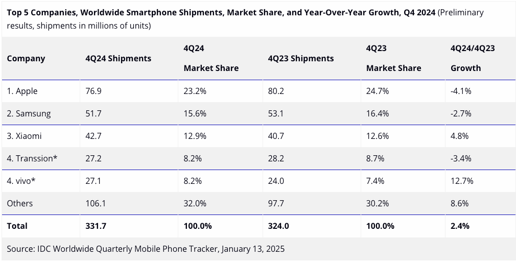 We’re following up on our comments from earlier on Monday about the smartphone market because research firm IDC has also published its Q4 2024 and 2024 smartphone shipment findings.