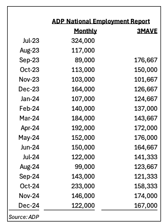 ADP’s assessment of job creation in December came in at 122,000 jobs, a slower pace compared to November’s 146,000 figure and below the market forecast of 140,000 for the last month of 2024.
