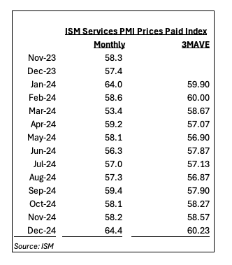 That message is also likely to be reiterated by several Fed heads making the rounds on Wednesday and Thursday, especially following what we saw in the price data from Tuesday's December ISM Service PMI. Whether we look at the monthly trend or the three-month moving average (3MAVE), it’s pretty clear inflation pressures in the service part of the economy have not been cooperating with the Fed’s objective.