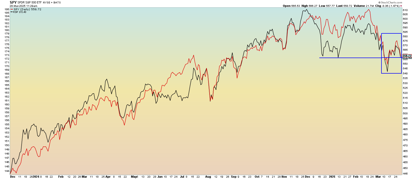 As we approach the end of March, it is time to revisit the SPY vs. RSP chart. Recall the RSP is the equal-weighted S&P 500 ETF, which gives each member an equal vote towards valuing the index, while the SPY is a cap-weighted ETF that gives more weighting to the largest market capitalization names. Think Mag 7 and other heavily weighted Nasdaq names.